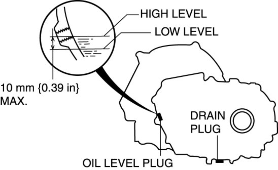 6. Remove the oil level plug with washer and add the specified amount and type of oil through the oil level plug hole until the level reaches the bottom of the oil level plug hole.