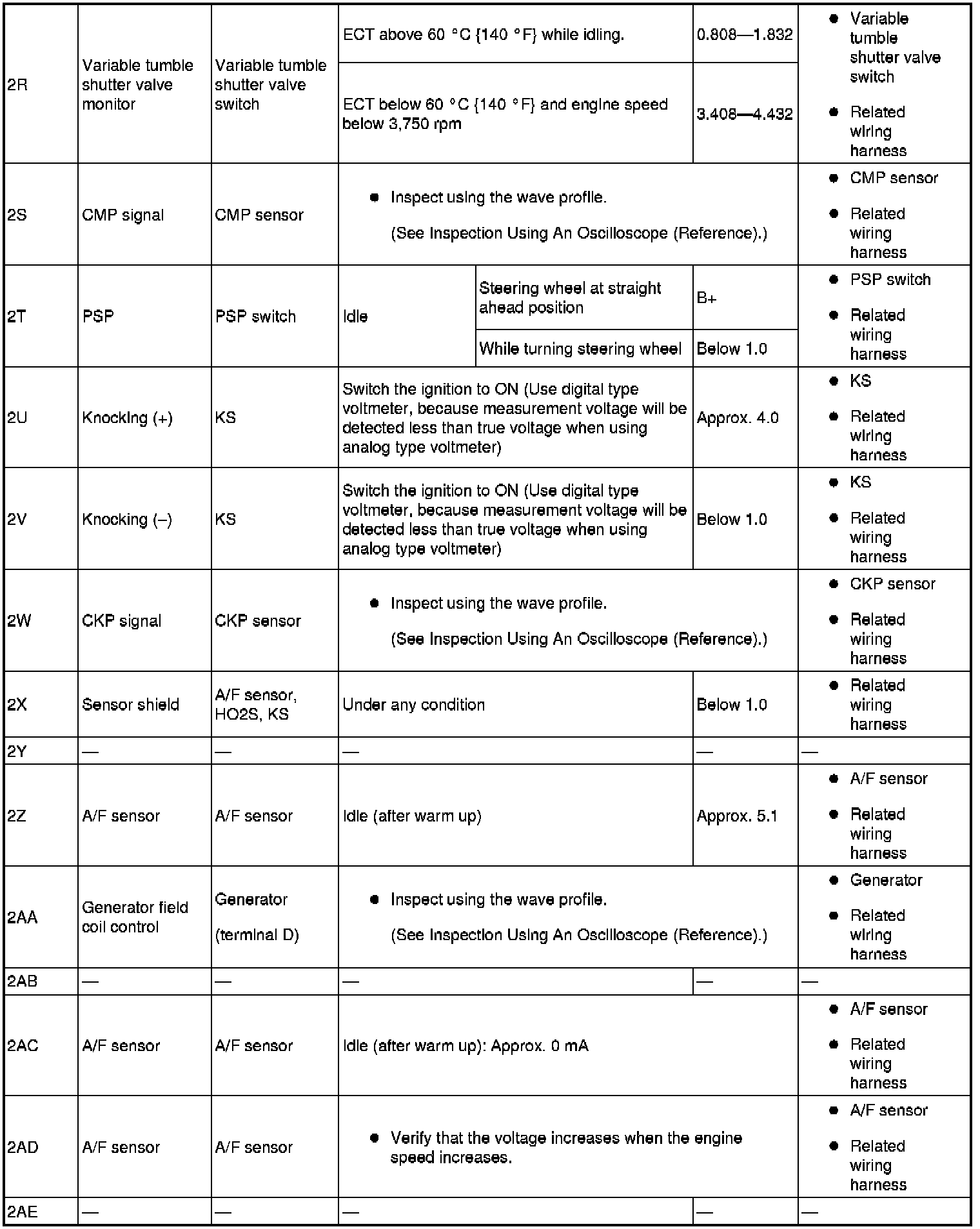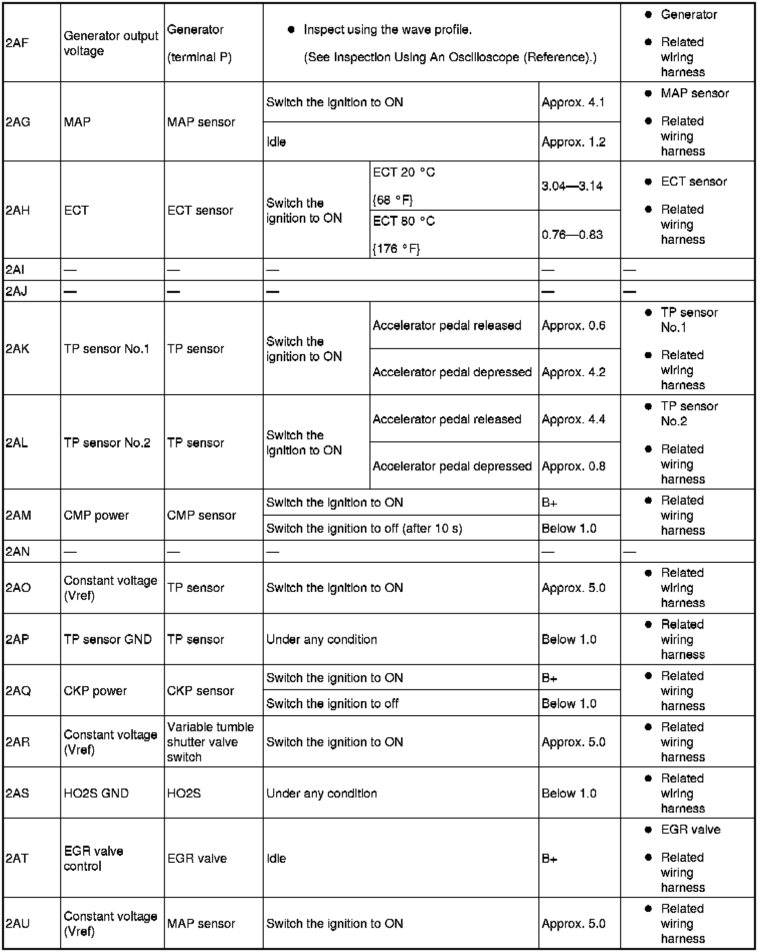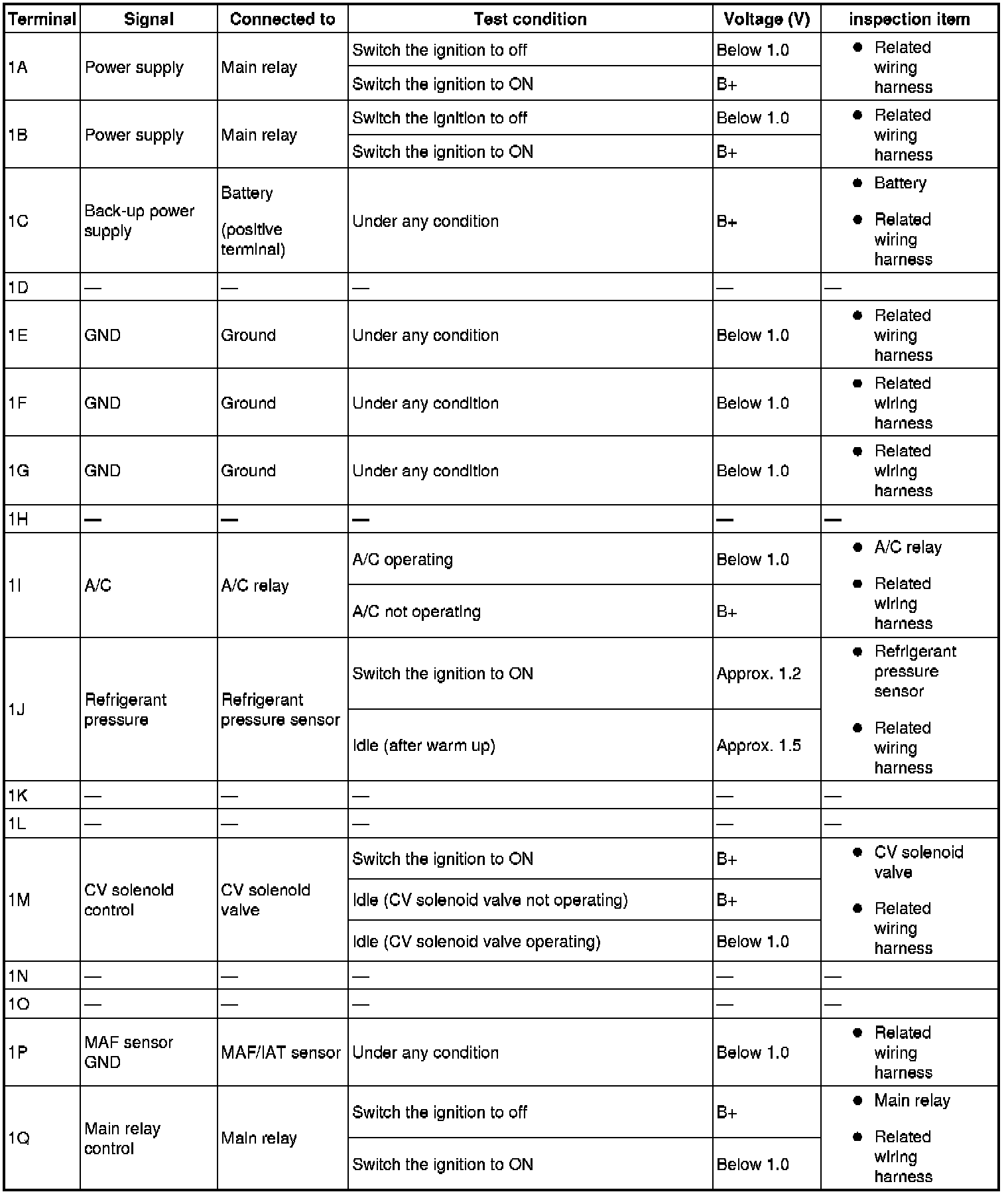 - The PCM terminal voltages vary with change in measuring conditions and vehicle conditions. Always carry out a total inspection of the input systems, output systems, and PCM to determine the cause of trouble. Otherwise, a wrong diagnosis will be made.