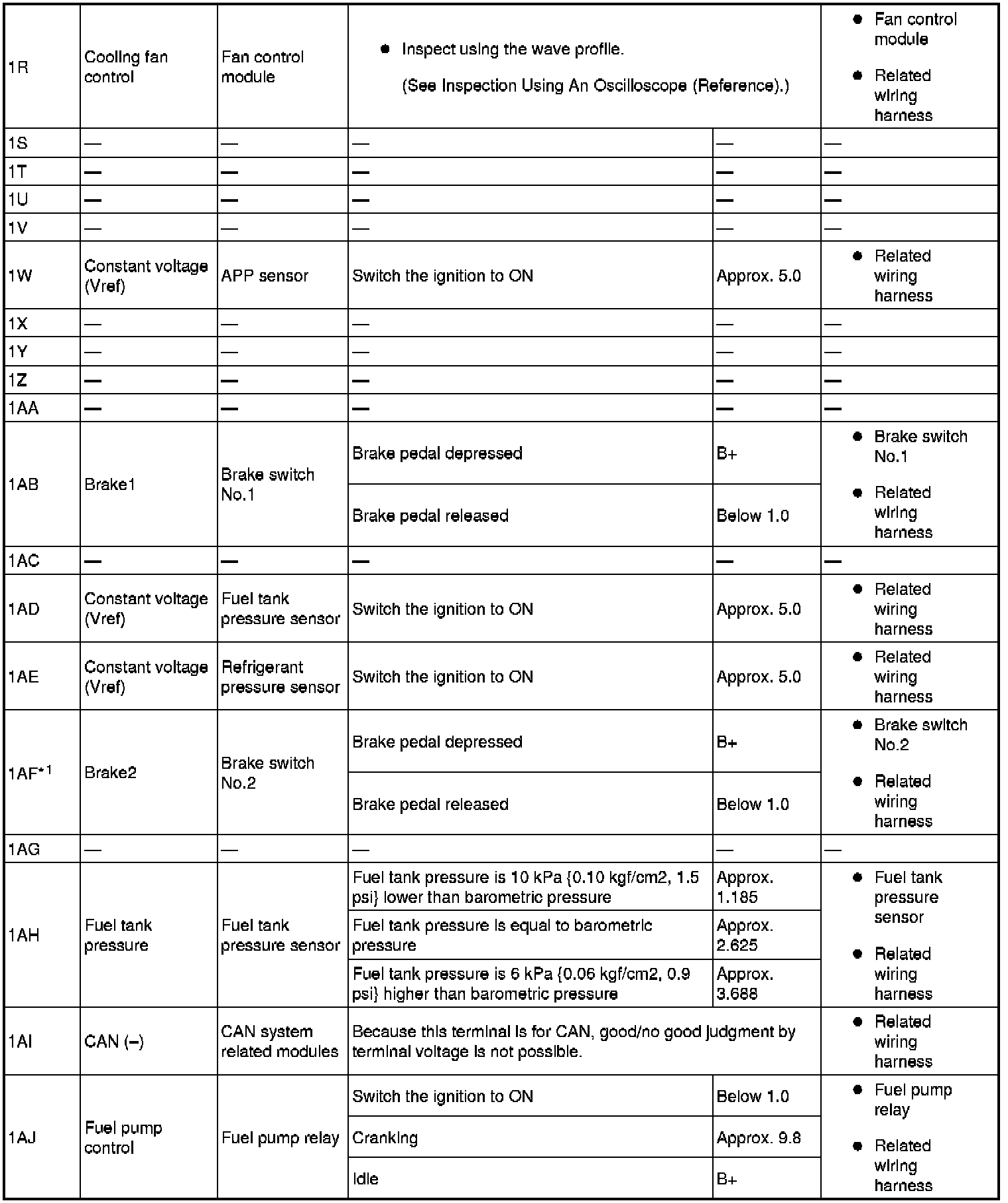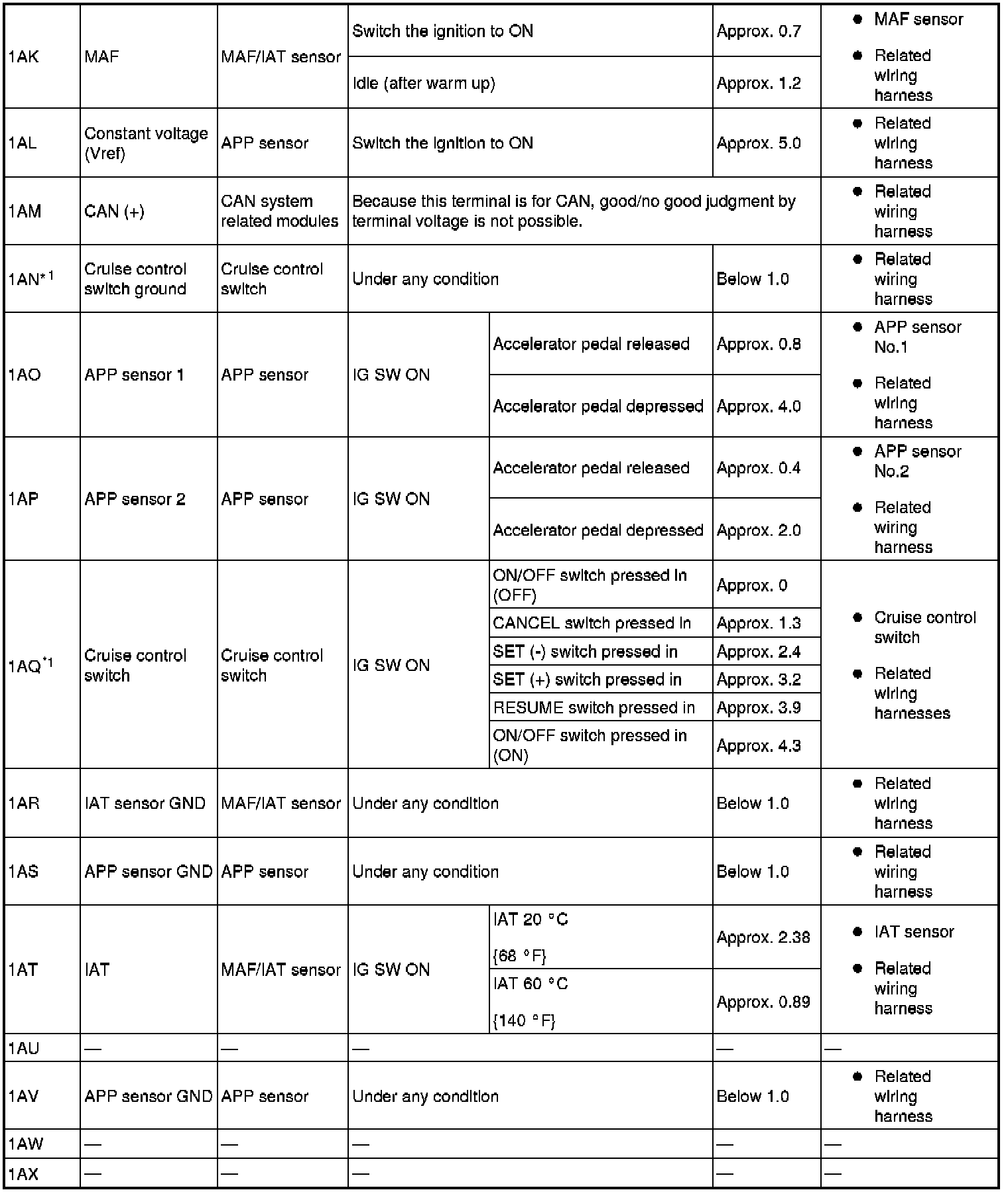 - If any incorrect voltage is detected, inspect the related system(s), wiring harnesses and connector(s) referring to the Action column in the terminal voltage table.