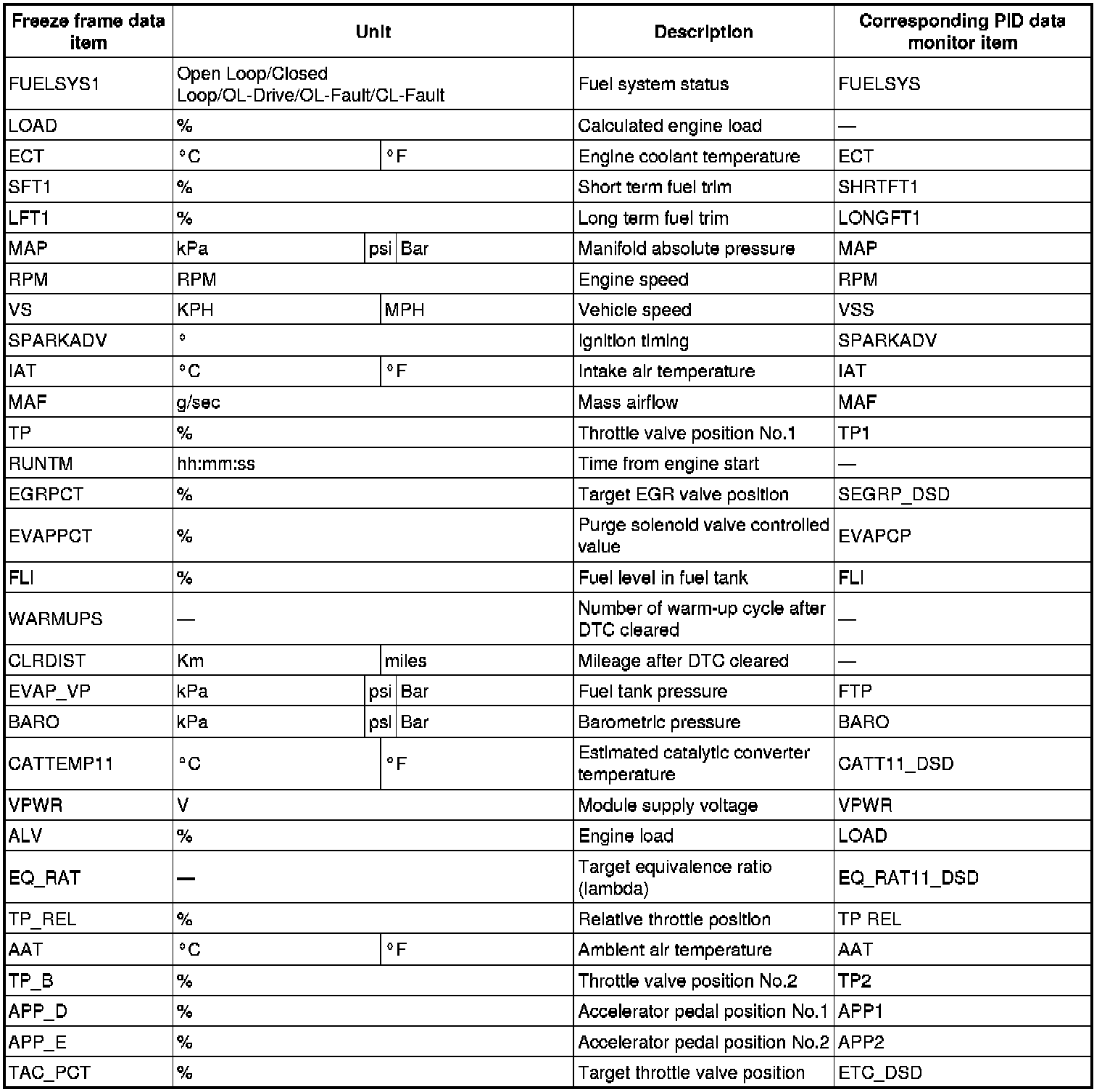 - The freeze frame data consists of data for vehicle and engine control system operation conditions when malfunctions in the engine control system are detected and stored in the PCM.