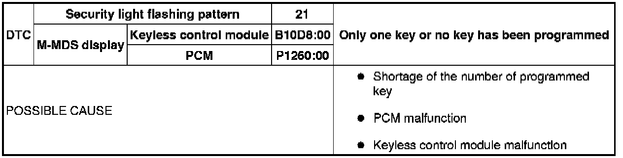 SECURITY LIGHT: 21, DTC: B10D8:00/P1260:00 [IMMOBILIZER SYSTEM (ADVANCED KEYLESS ENTRY AND PUSH BUTTON START SYSTEM)]