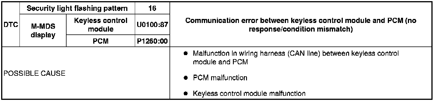 SECURITY LIGHT: 16, DTC: U0100:87/P1260:00 [IMMOBILIZER SYSTEM (ADVANCED KEYLESS ENTRY AND PUSH BUTTON START SYSTEM)]