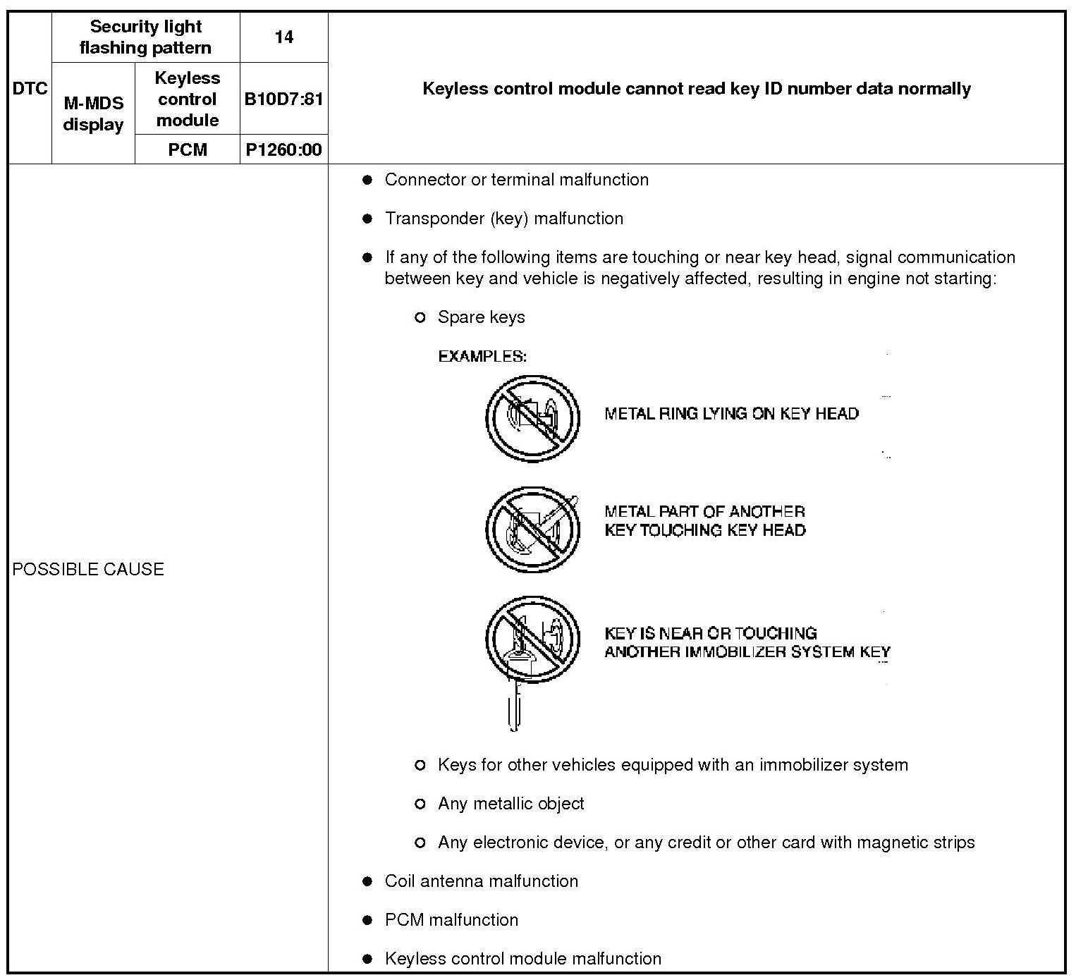 SECURITY LIGHT: 14, DTC: B10D7:81/P1260:00 [IMMOBILIZER SYSTEM (ADVANCED KEYLESS ENTRY AND PUSH BUTTON START SYSTEM)]
