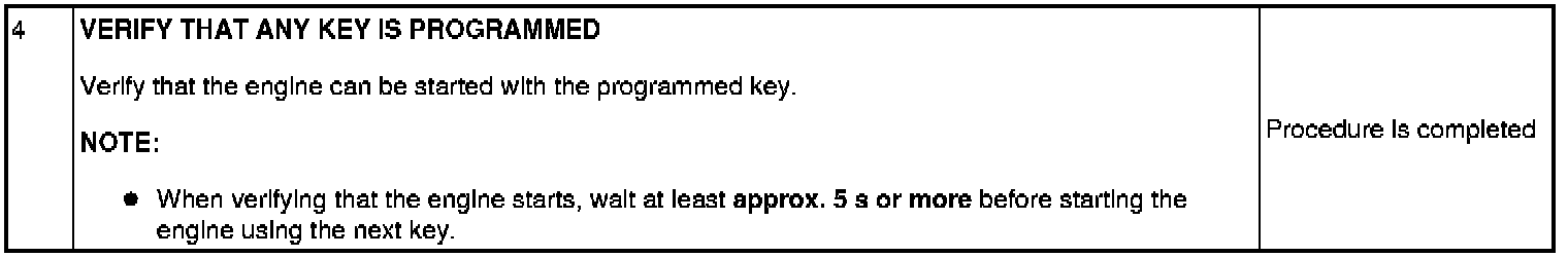 - If the engine is started during immobilizer system-related parts programming, the programming mode cancels. Therefore, do not start the engine unless indicated in the procedure. Repeat the procedure from the beginning if the engine is started during the immobilizer system-related parts programming.