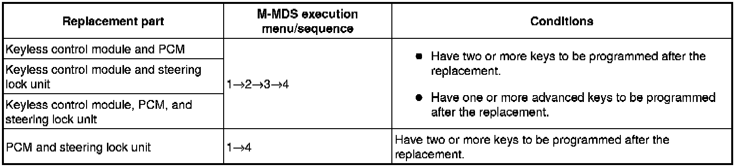 - When replacing the keyless control module or the steering lock, remove the valid keys or valid advanced keys from the vehicle (keep them 1 m or more from the vehicle) and switch the ignition on according to the directions on the M-MDS screen. Select, "There is no programmed ignition key and programmed advanced key" from the M-MDS screen.
