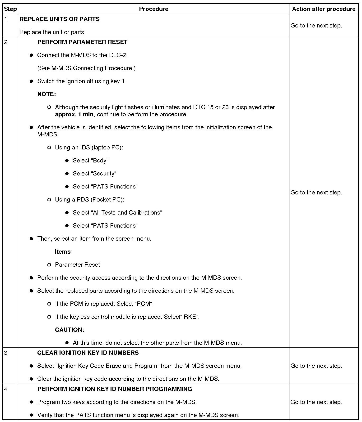 Immobilizer System-Related Parts Service and Programming Procedure Table