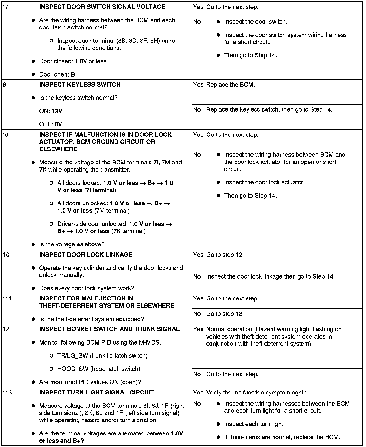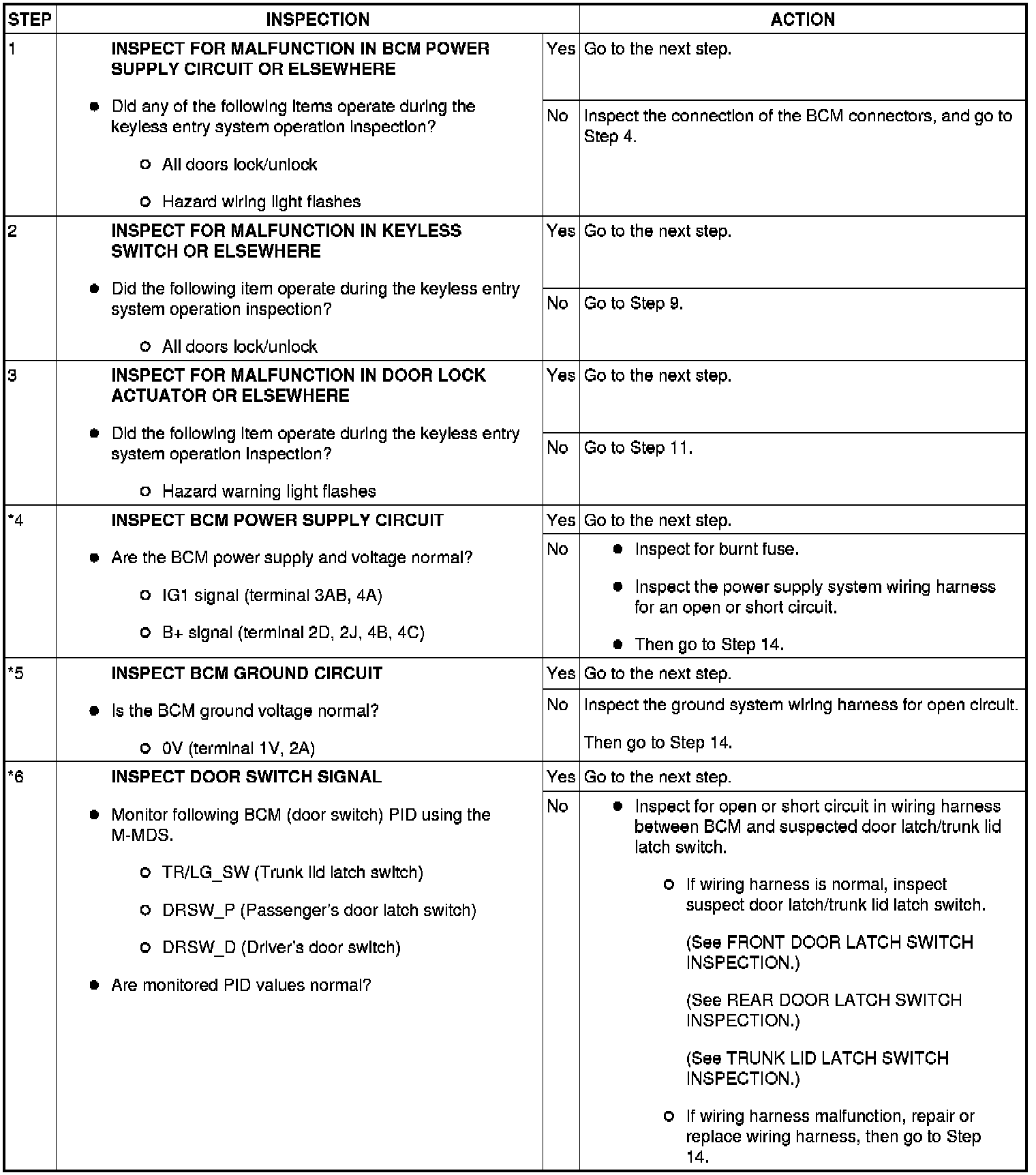- When performing an asterisked (*) troubleshooting inspection, slightly shake the wiring harness and connectors while performing the inspection to discover whether poor contact points are the cause of any intermittent malfunctions. If there is a problem, verify that the connectors, terminals and wiring harnesses are connected correctly and undamaged.