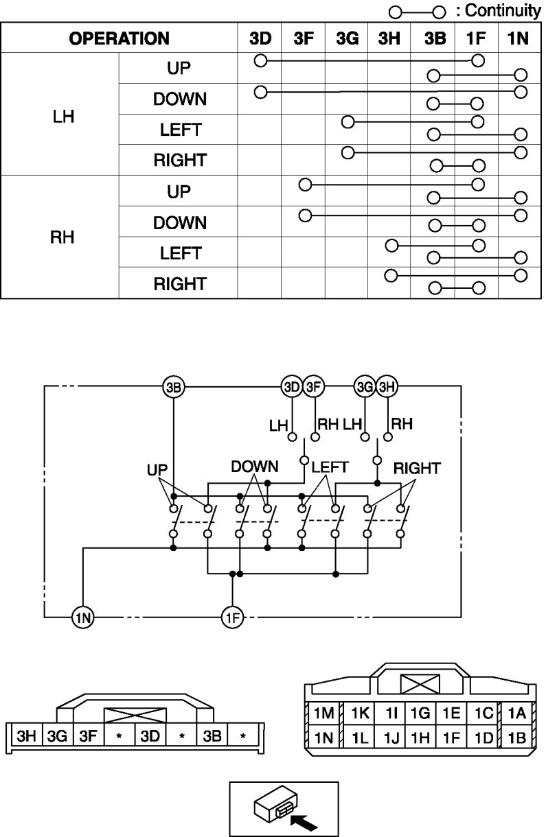 7. Using a tester, verify that the continuity between the power outer mirror switch terminals is as indicated in the table.