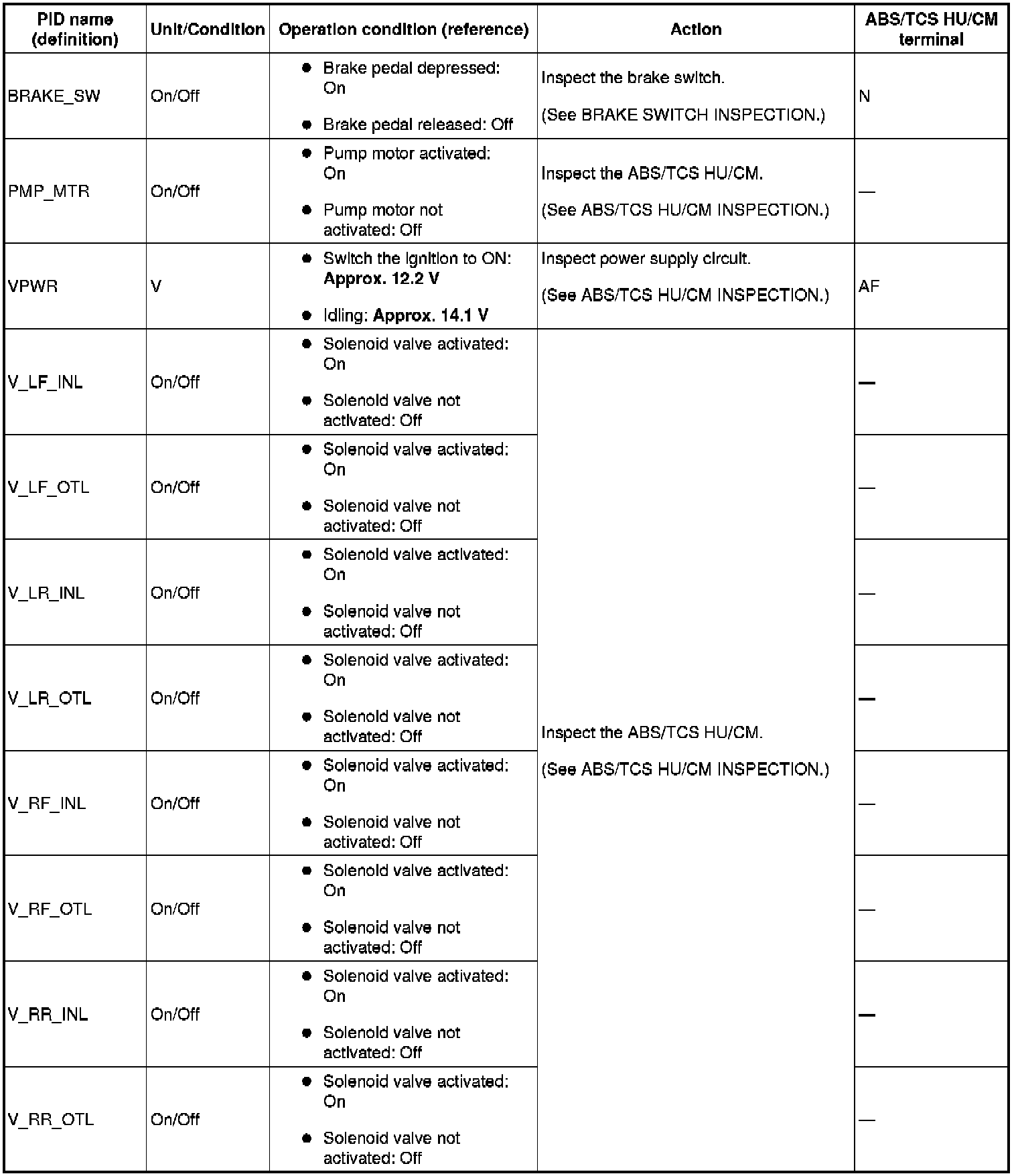 PID/DATA Monitor Table - ABS/TCS