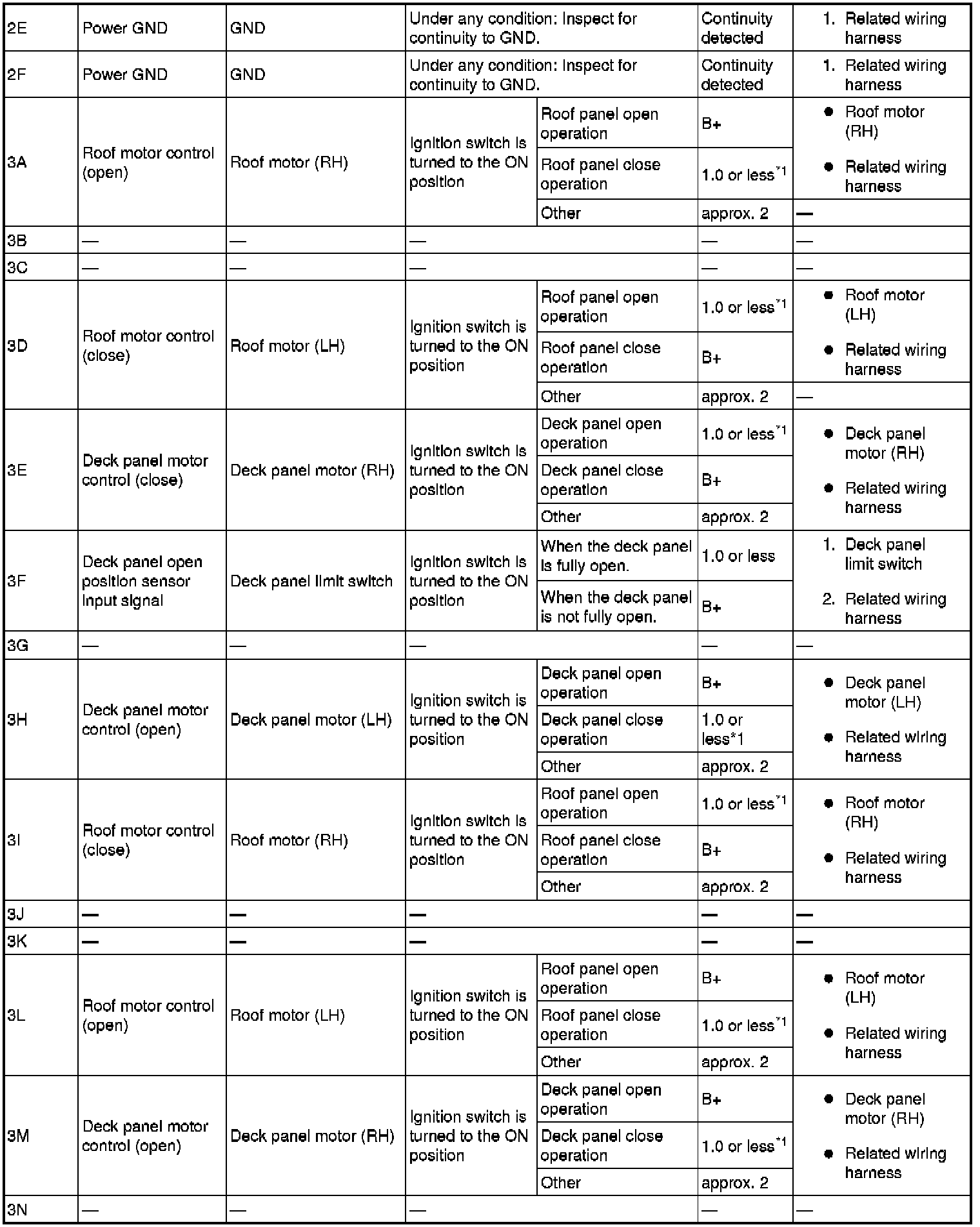 2. Attach the tester lead to the power retractable hardtop control module wiring harness-side connector and inspect voltage, continuity, or resistance according to the standard (reference) on the table.