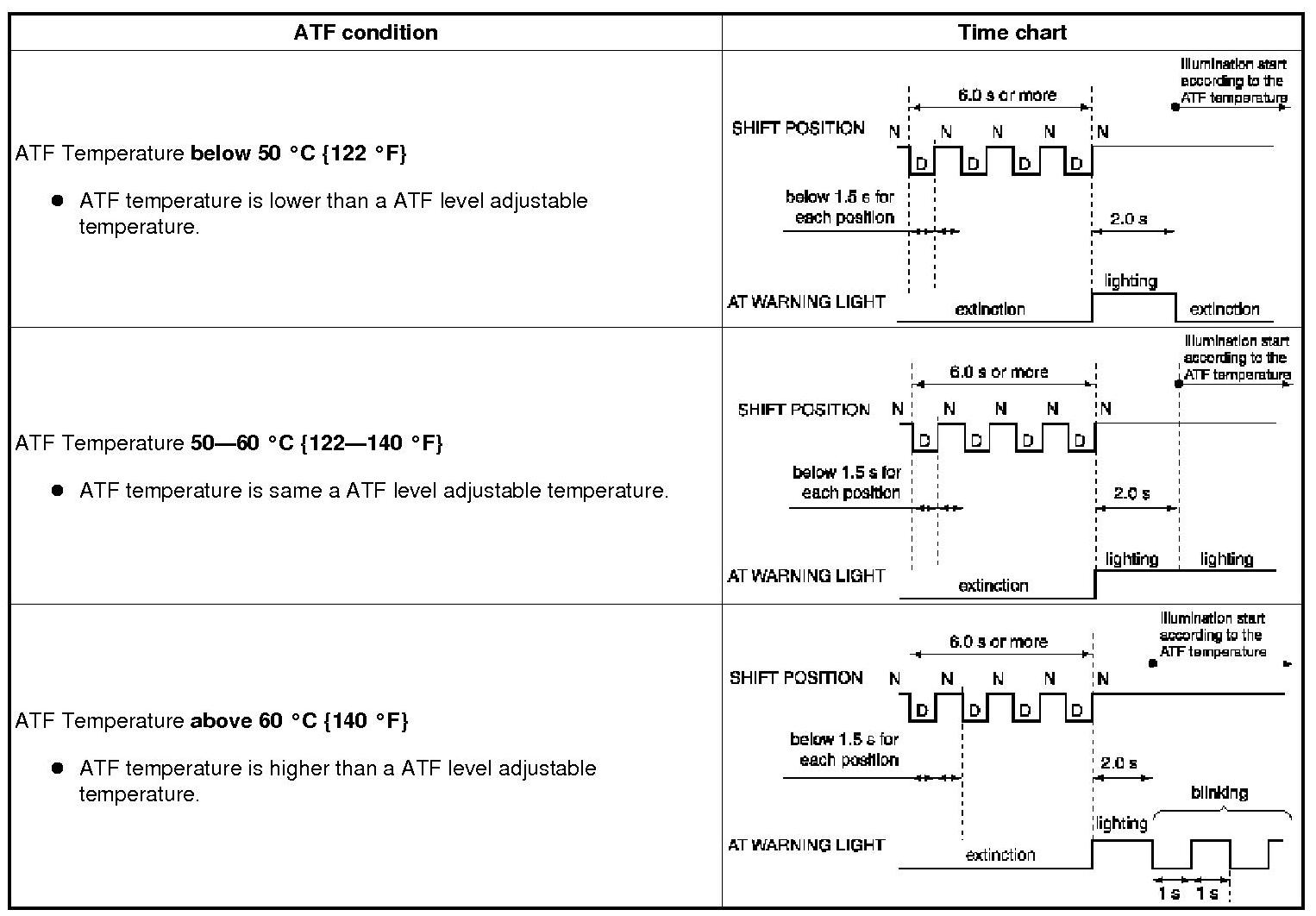 - When adjusting the ATF level, refer to the following chart and verify the specified ATF temperature(50-60 °C {122-140 °F}).