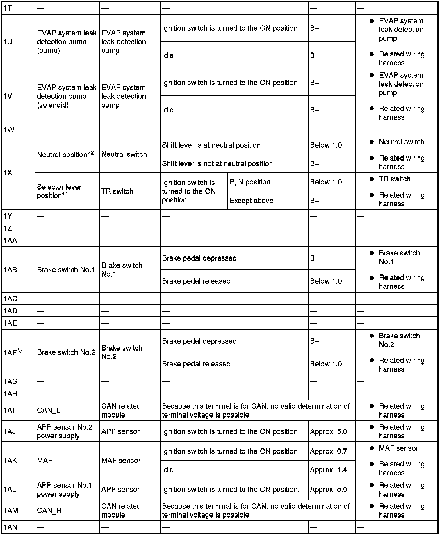 - For input/output signals except those of the monitoring items, use a voltmeter to measure the PCM terminal voltage.