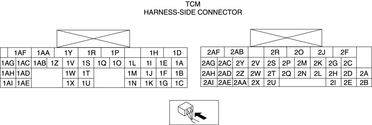 - Use the ground of terminal 1P and 1X of the TCM when measuring terminal voltage, as an error may occur when connecting the negative circuit tester to ground.