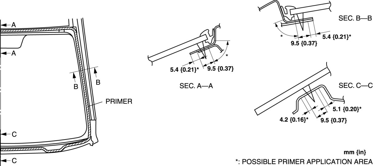 8. If the sealant has come off completely in any one place, apply some primer after degreasing, and allow it approx. 30 min to dry. Then apply 2 mm {0.07 in} thickness of new sealant.