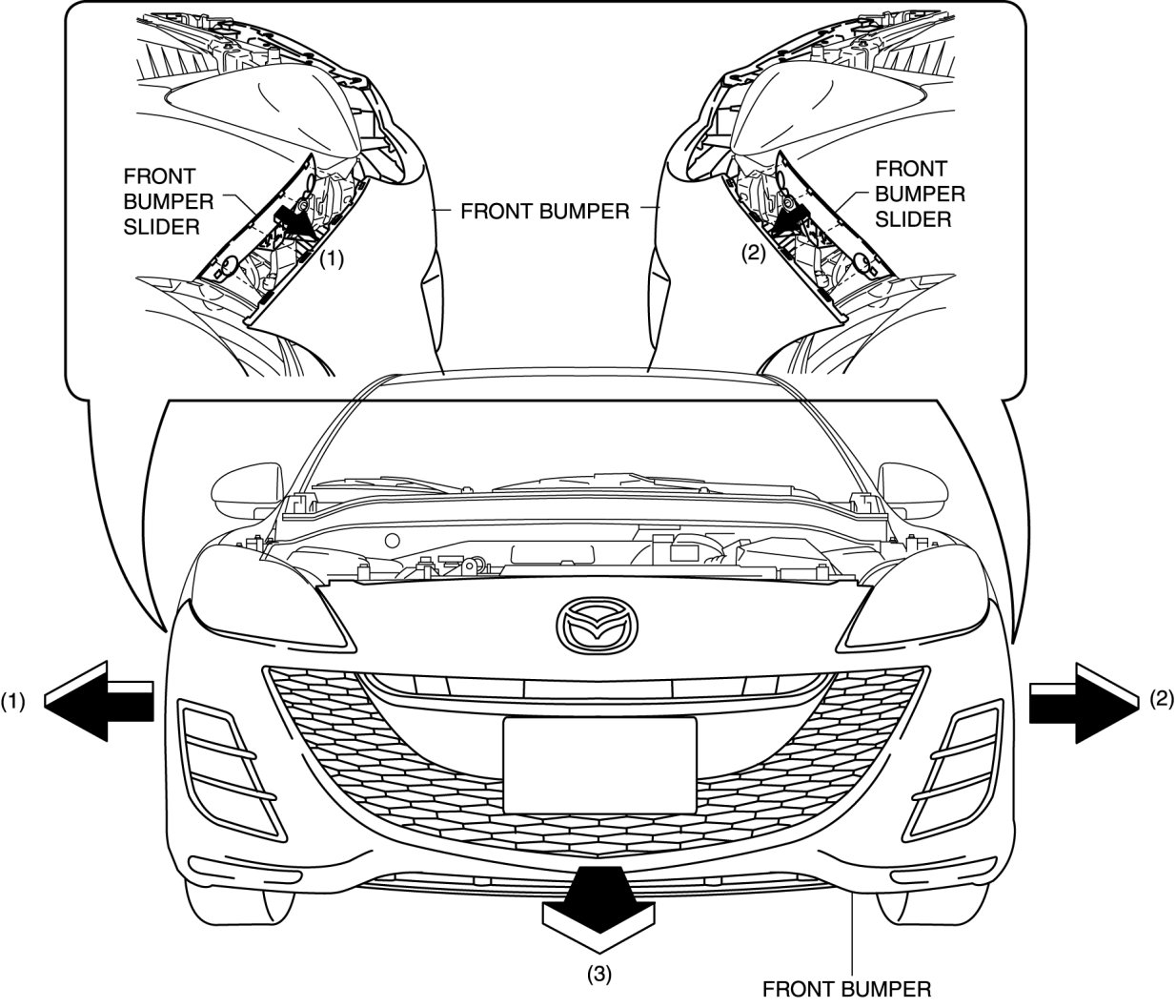 7. Pull the front bumper in the direction of the arrow in the order of (1), (2) and (3), then remove the front bumper.