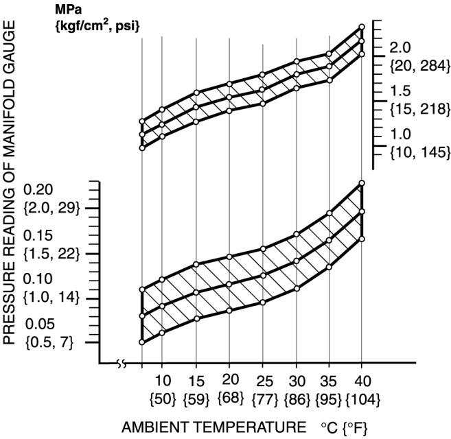 10. Verify that the intersection of the pressure reading of the manifold gauge and ambient temperature is in the shaded zone.