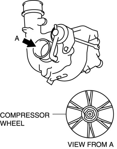 2. Visually inspect the compressor wheel from view A for the cracks, damage, or bending on all the compressor wheel blades.
