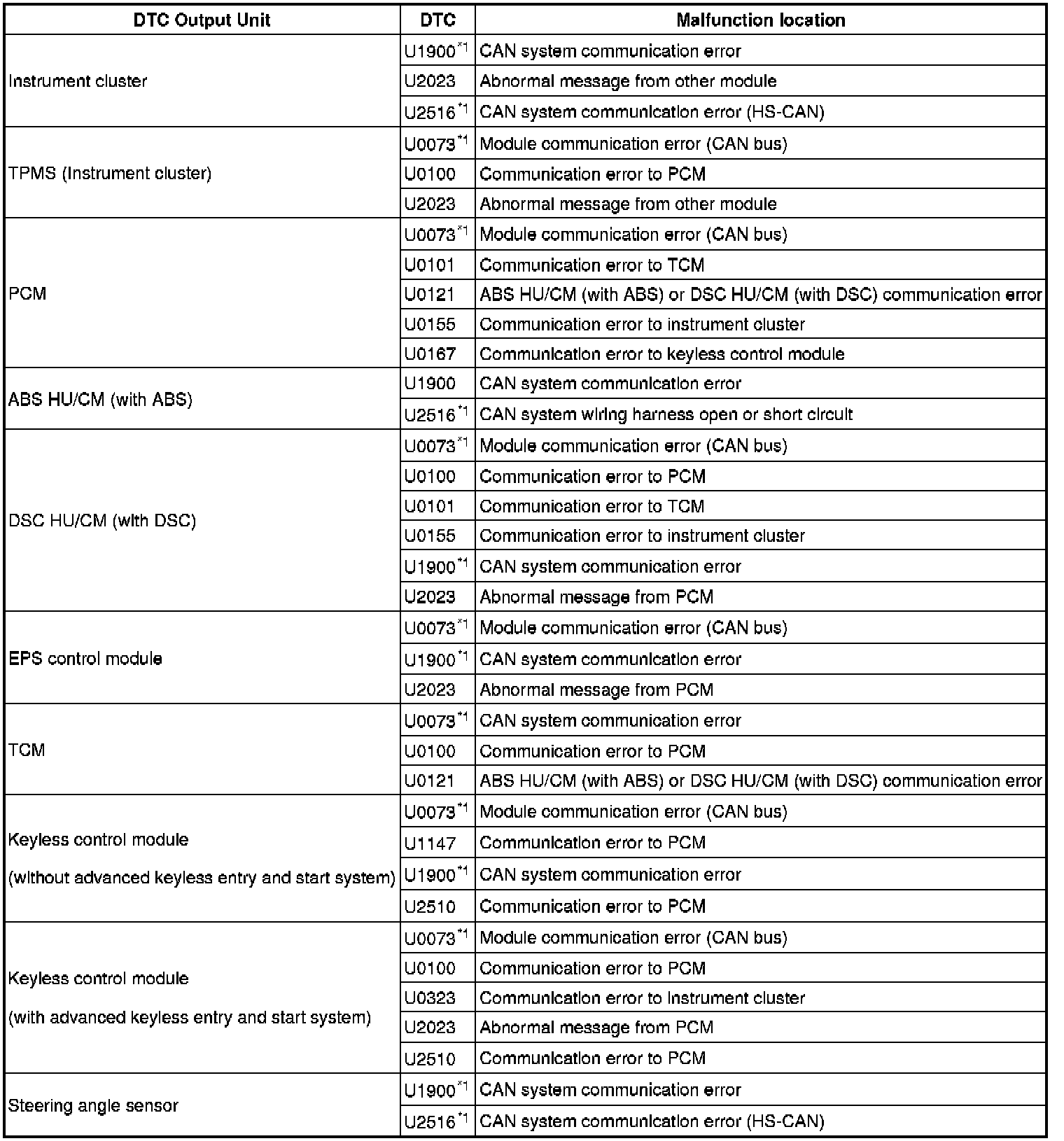 DTC Table - Multiplex Communication System