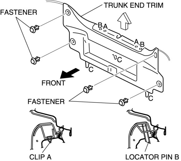2. Pull the trunk end trim upward, then detach clips A, locator pins B, and tabs C.