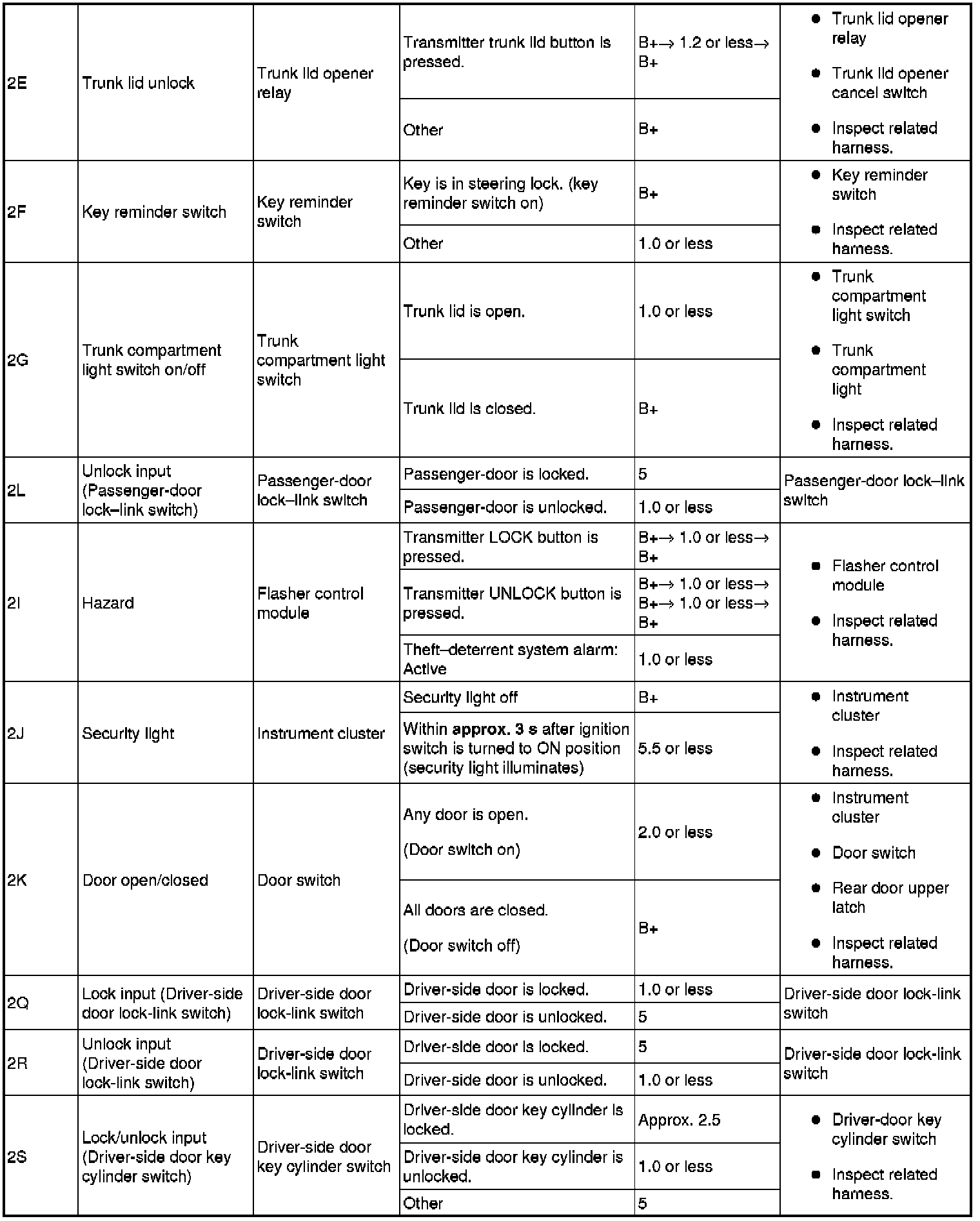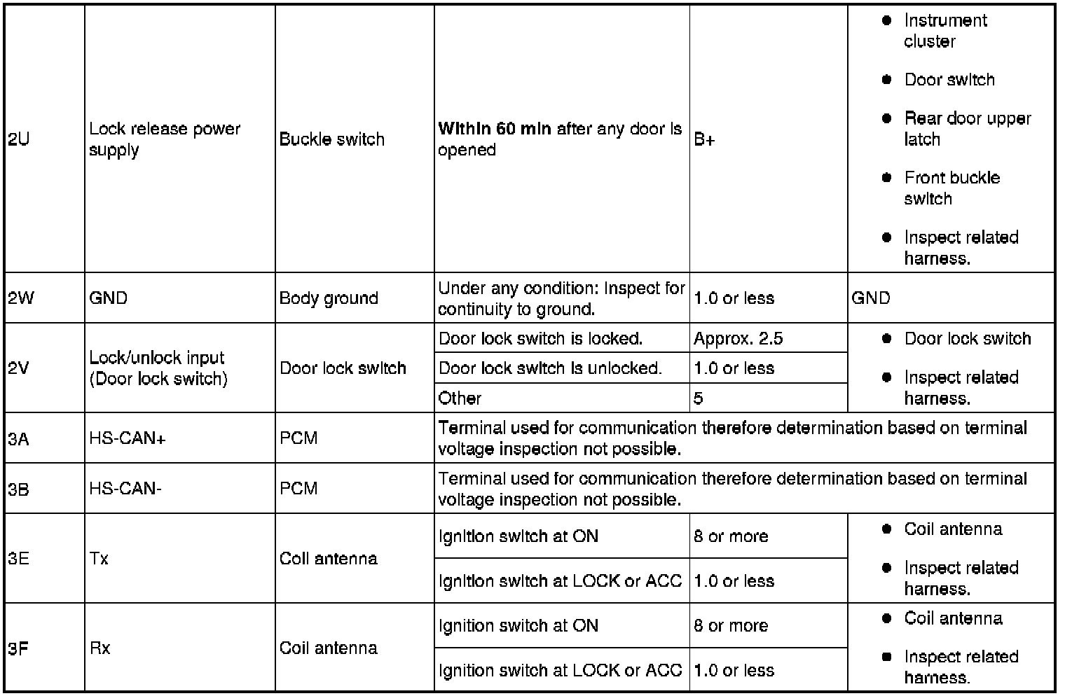 1. Measure the voltage or inspect for continuity according to the Terminal Voltage Table (Reference).