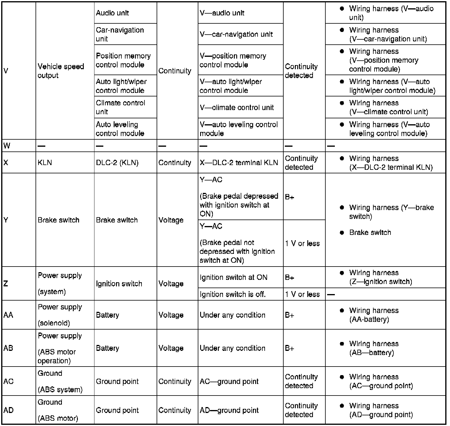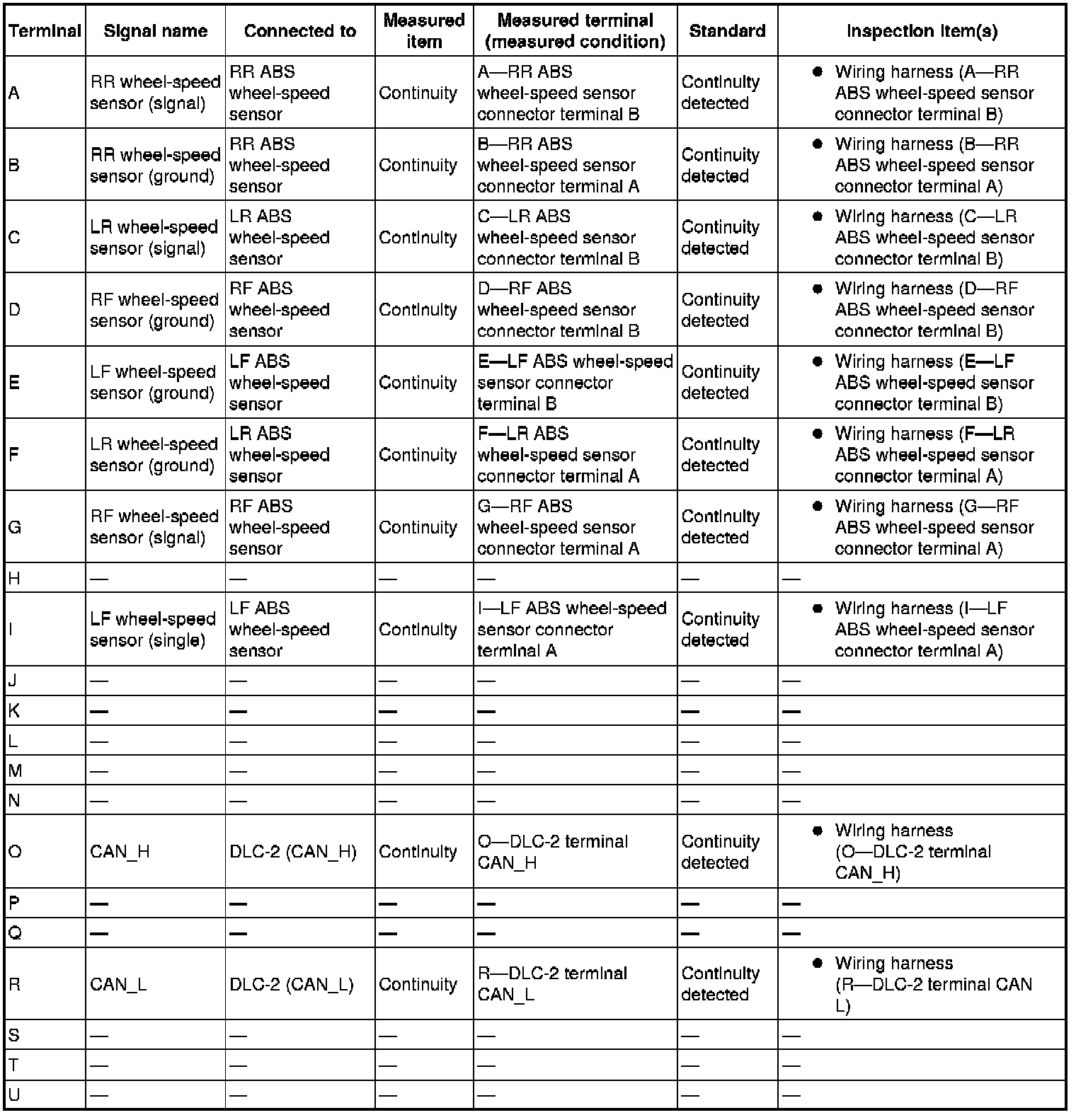 3. Attach the tester lead to the ABS HU/CM harness side connector, then inspect voltage, continuity or resistance according to the standard (reference value) on the table.