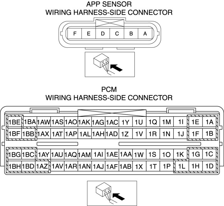 2. Verify that the voltage at PCM terminals 1AO (M-MDS PID: APP1) and 1AP (M-MDS PID: APP2) increases while gradually increasing the accelerator pedal opening angle according to the accelerator pedal opening angle.