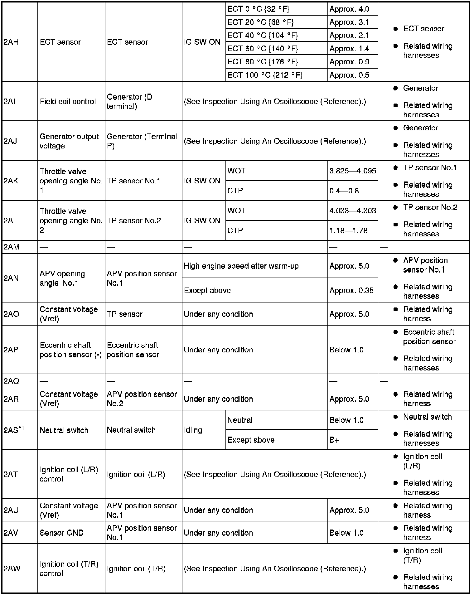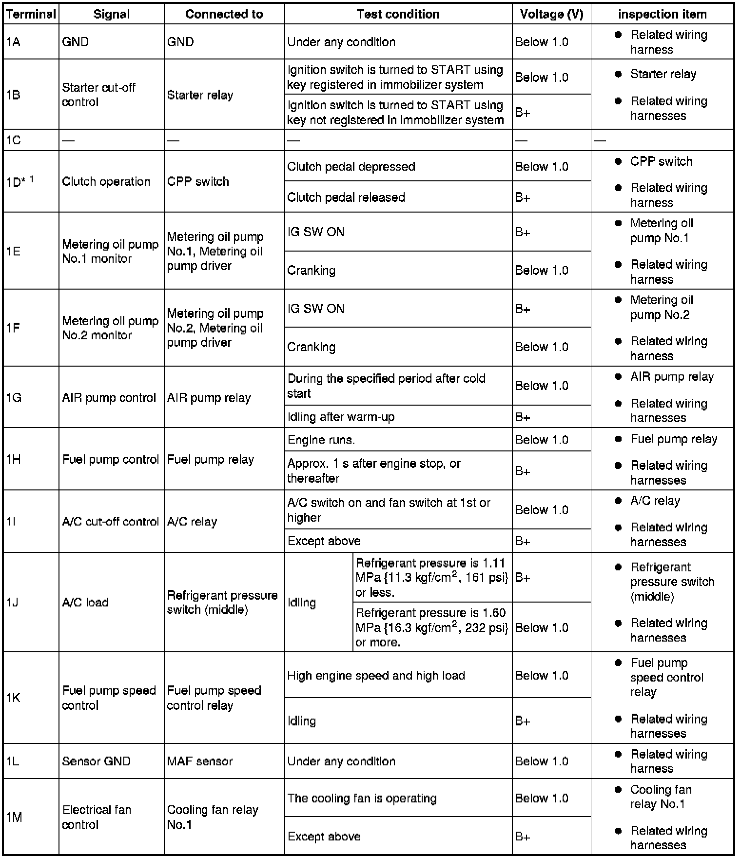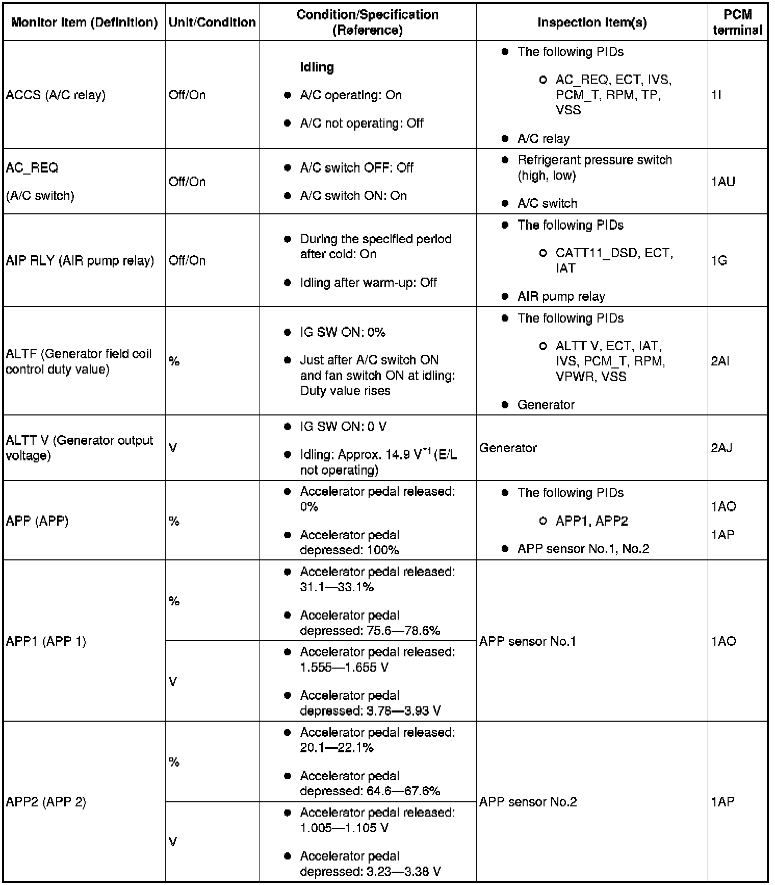 - The PCM terminal voltages vary with change in measuring conditions and vehicle conditions. Always carry out a total inspection of the input systems, output systems, and PCM to determine the cause of trouble. Otherwise, a wrong diagnosis will be made.