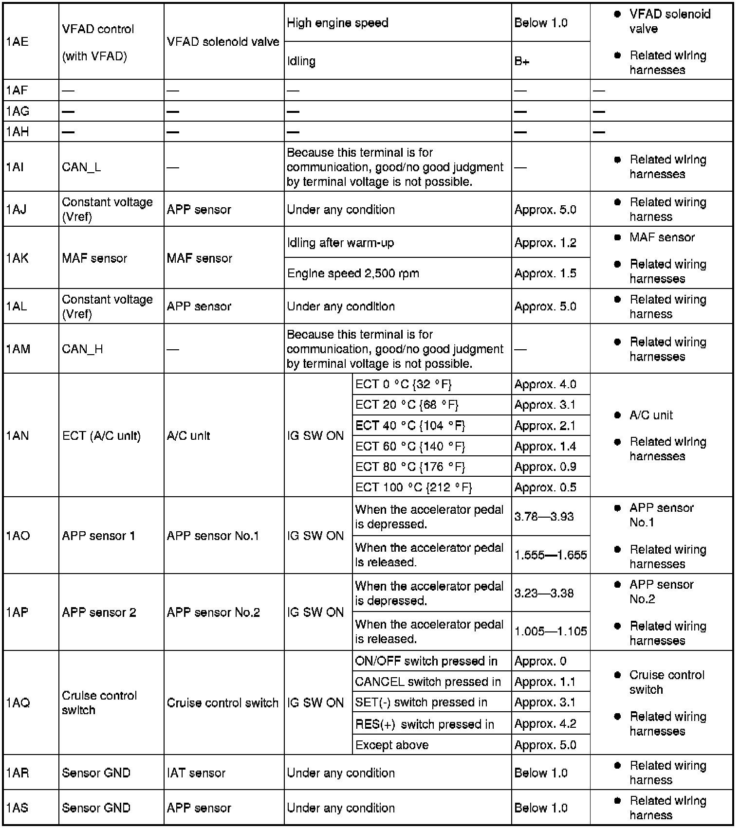 - If any incorrect voltage is detected, inspect the related system(s), wiring harnesses and connector(s) referring to the Action column in the terminal voltage table.