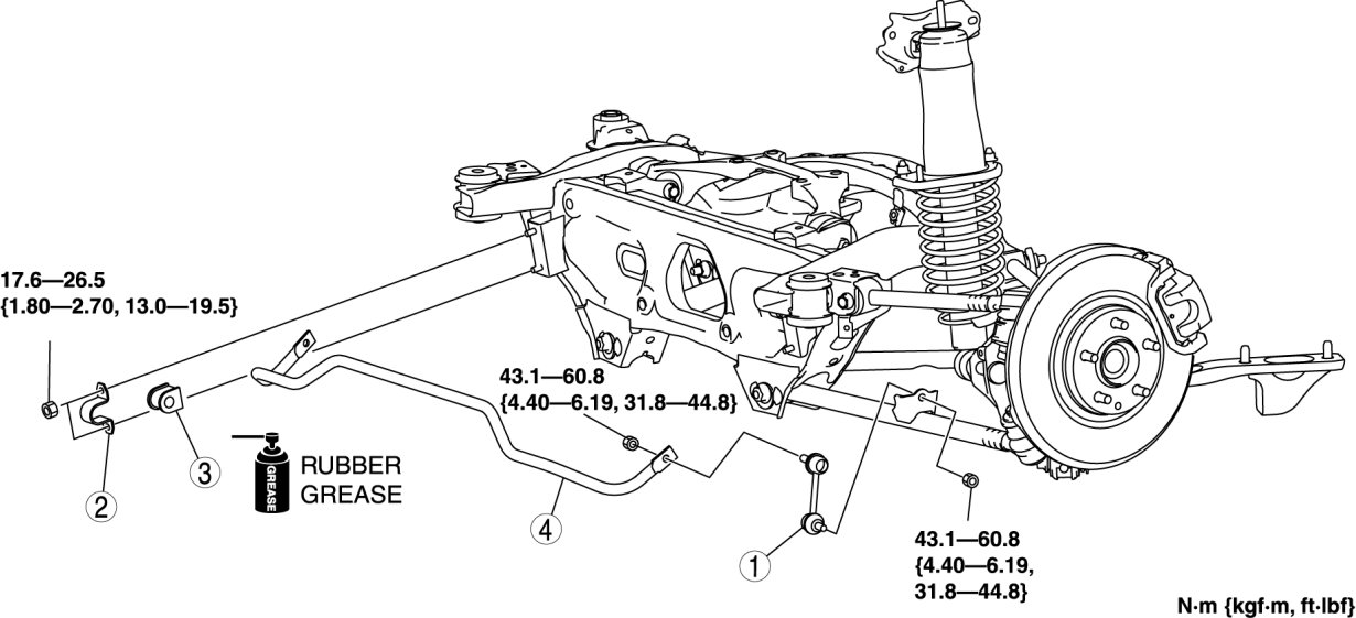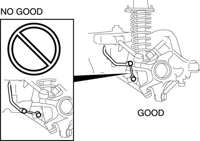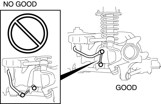 - Be sure to install the stabilizer control link in the proper position. If it is not installed properly, the stabilizer control link may interfere with peripheral components when driving, causing damage to each other.