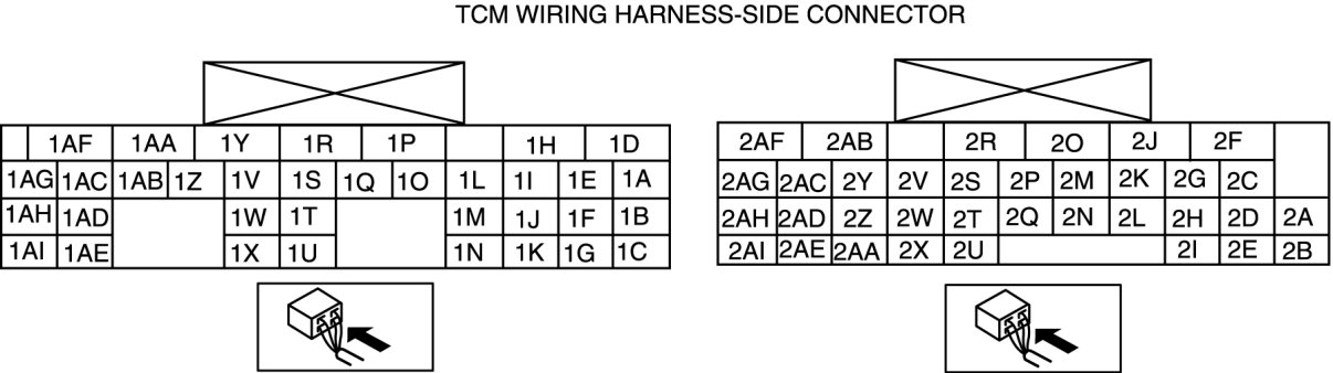 - Use the ground of terminal 1P and 1X of the TCM when measuring terminal voltage, as an error may occur when connecting the negative circuit tester to ground.