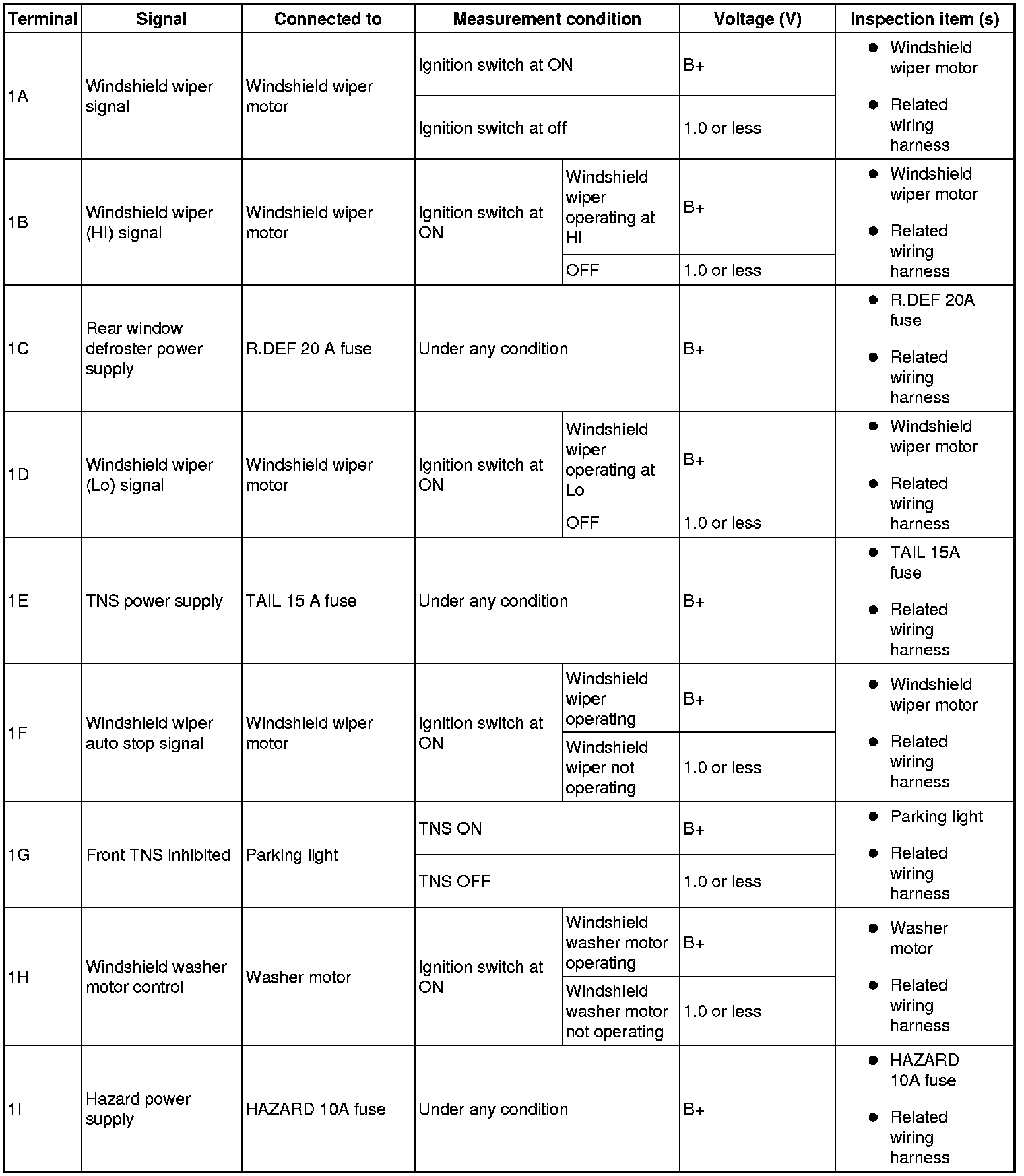 - If the voltage or continuity is not as specified in the Terminal Voltage Table (Reference), inspect the parts under "Inspection item (s)".