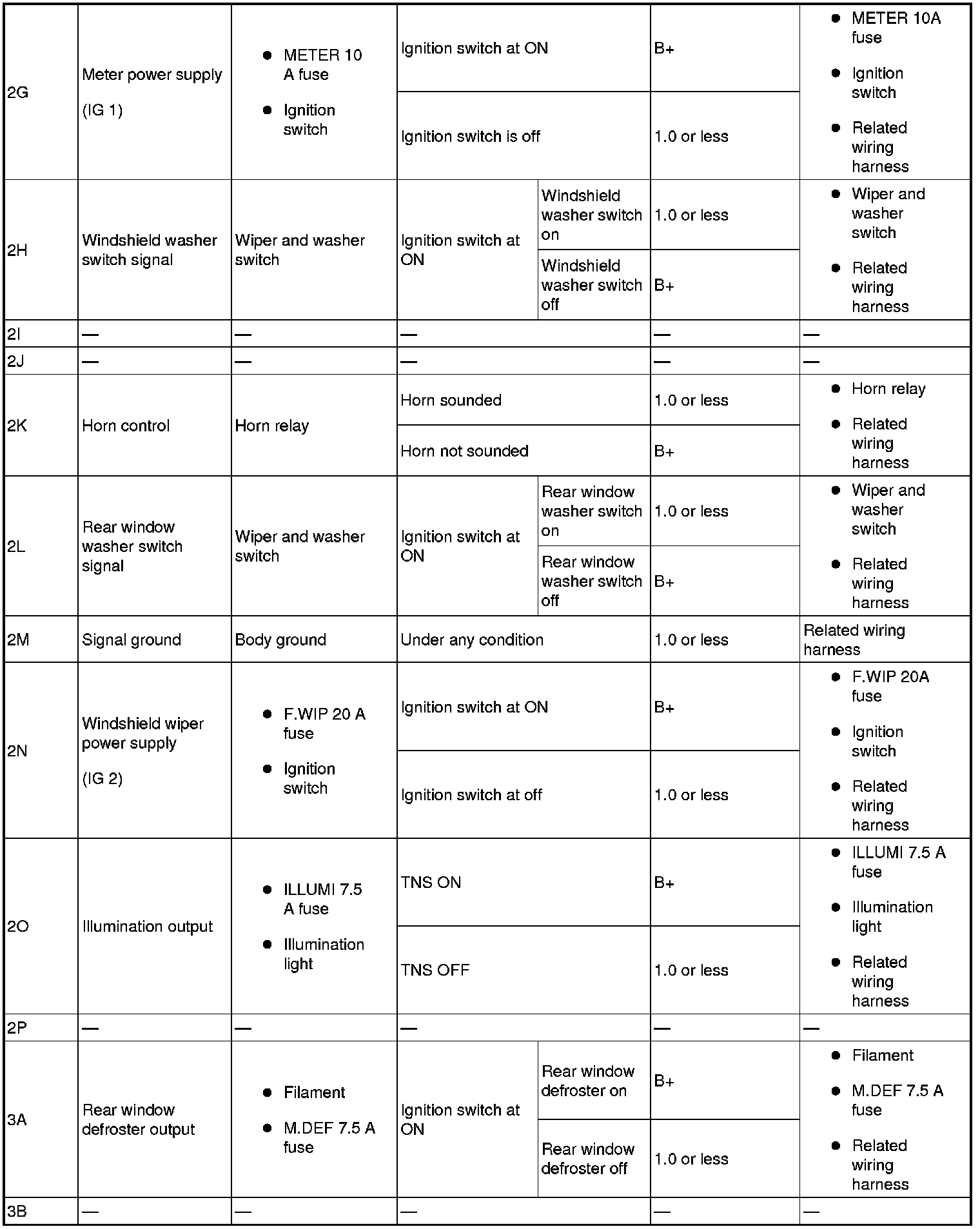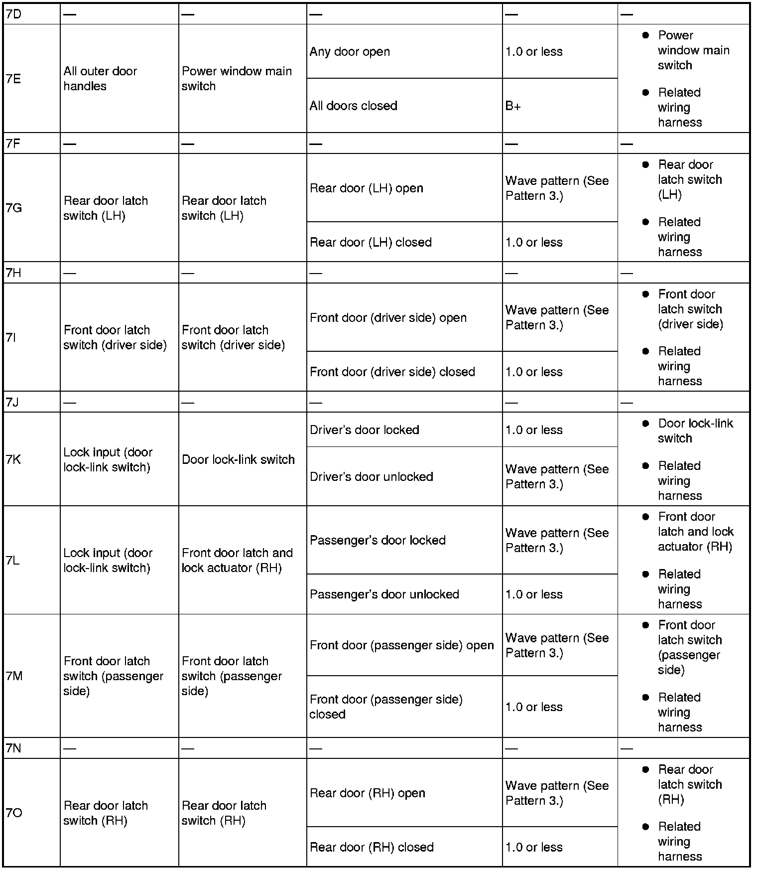 - Rear door latch switch (LH): 7G (+) -> body ground (-)