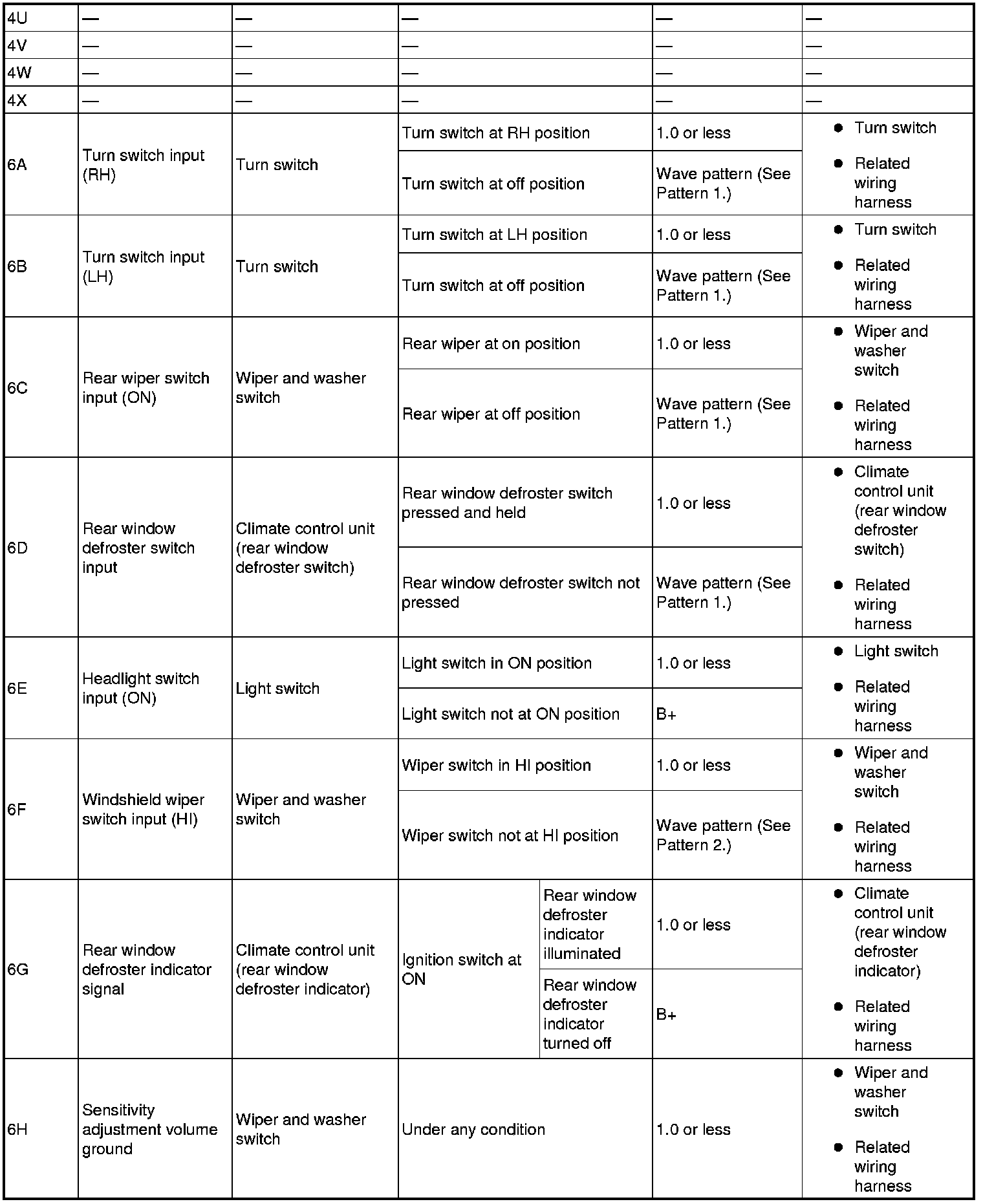- Rear wiper switch input (ON): 6C (+) -> body ground (-)
