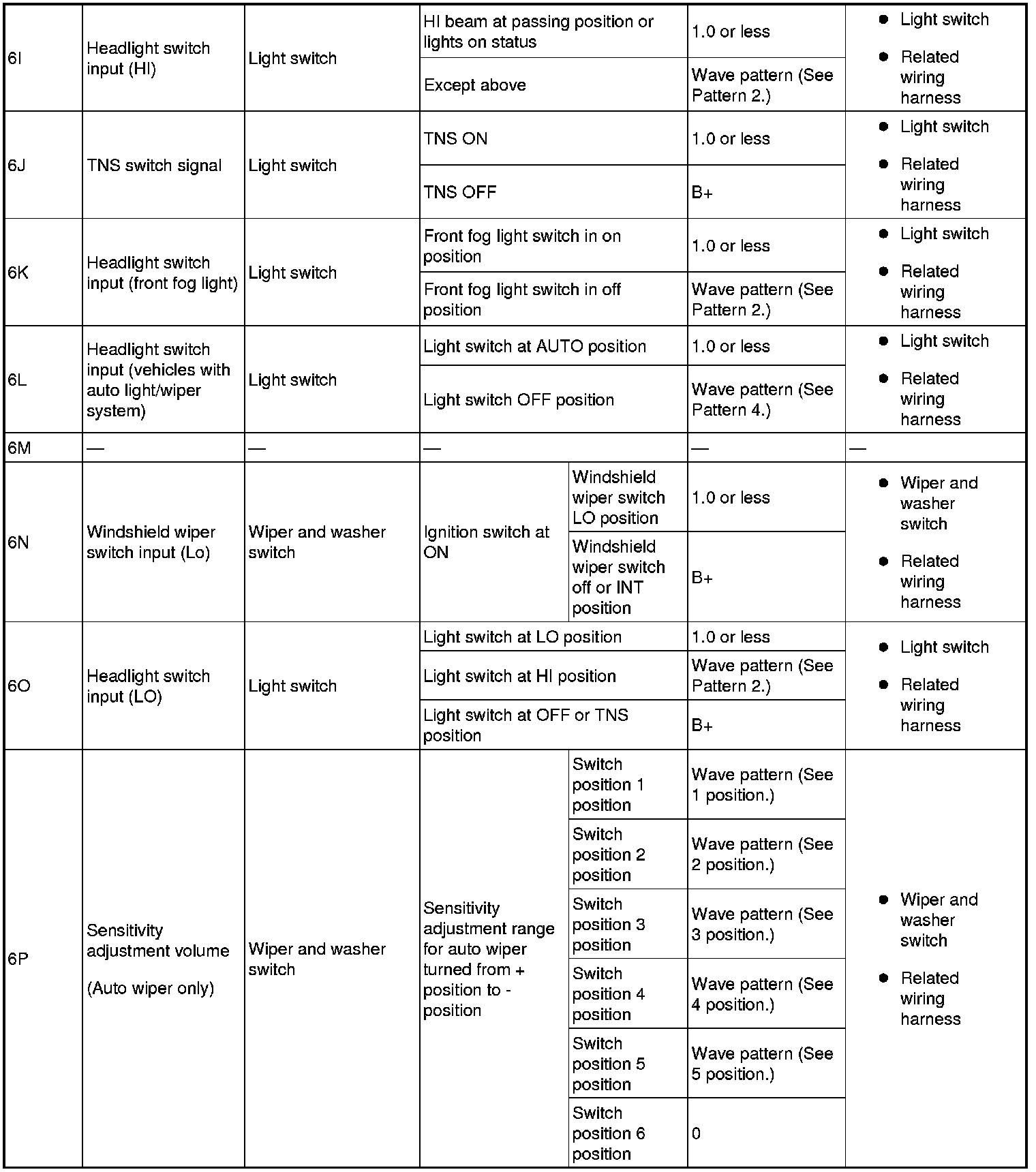 - Windshield wiper switch input: 6S (+) -> body ground (-)