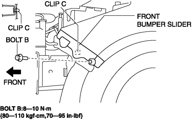 4. Remove bolt B and clip C, then remove the front bumper slider.