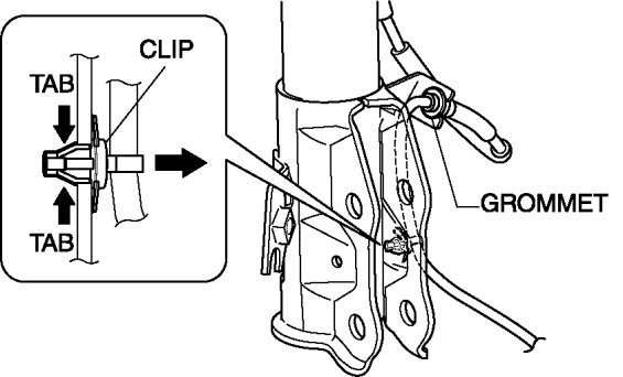 4. While pressing the tabs (2 locations) of the ABS wheel-speed sensor wiring harness clip, remove the ABS wheel-speed sensor wiring harness from the shock absorber.