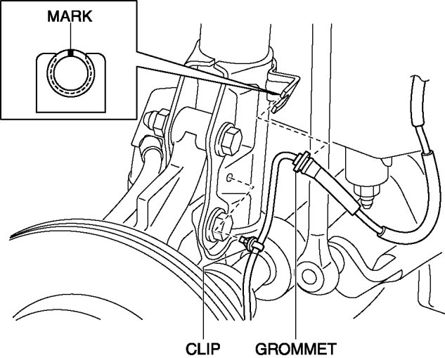 1. Install the ABS wheel-speed sensor wiring harness grommet to the shock absorber as shown in the figure.