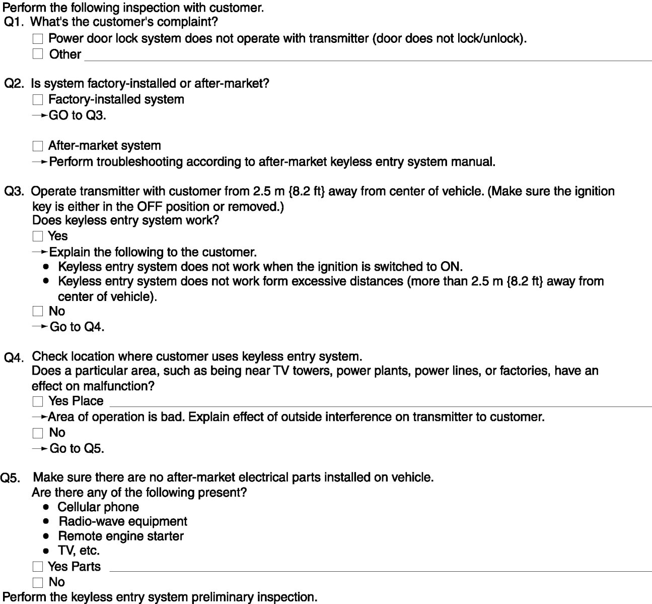 - If the symptom is "Power door lock system does not operate with transmitter at all," find out how the customer uses the keyless entry system by following the check sheet below.