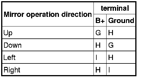 5. Apply battery positive voltage to the power outer mirror terminals and inspect the operation of the power outer mirror.