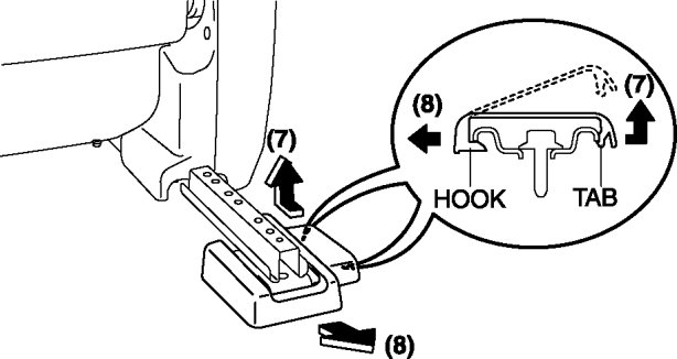7. Using a fastener remover, widen the rear outer cover in the direction of arrow (7) shown in the figure to release the tab, then remove the cover by pulling it in the direction of arrow (8).