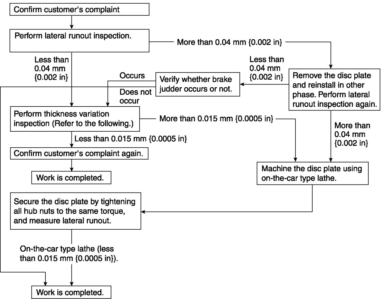 1. If the runout is more than 0.04 mm {0.002 in} at the position 10 mm {0.39 in} from the disc plate edge, uneven wear occurs on the disc plate because the pad contacts the plate unevenly.