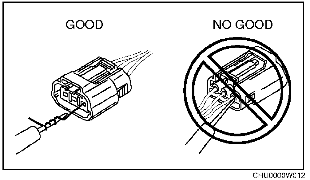 - When a tester is used to inspect for continuity or measuring voltage, insert the tester probe from the wiring harness side.