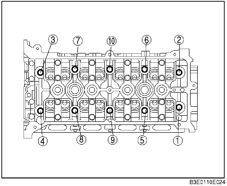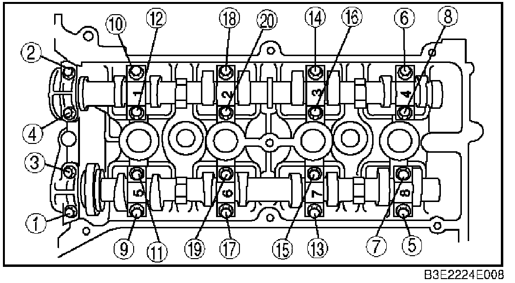 1. Loosen the camshaft cap installation bolts in two to three passes in the order shown in the figure, and remove them.