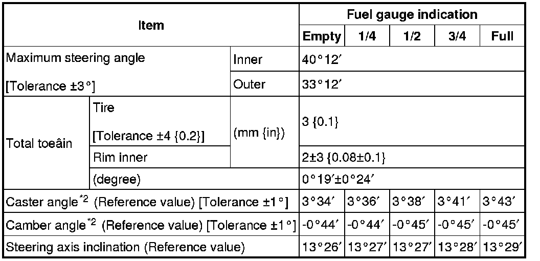 - Toe angle changes by approx. 6 mm {0.2 in} per one rotation of the tie rod for one wheel.