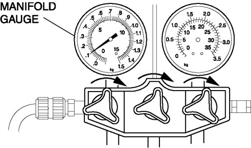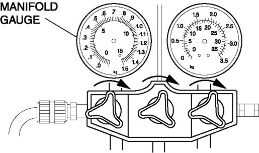3. Verify that high- and low-pressure side readings of the manifold gauge are at -101 kPa {-760 mmHg, -29.9 inHg}. Close each valve of the manifold gauge.