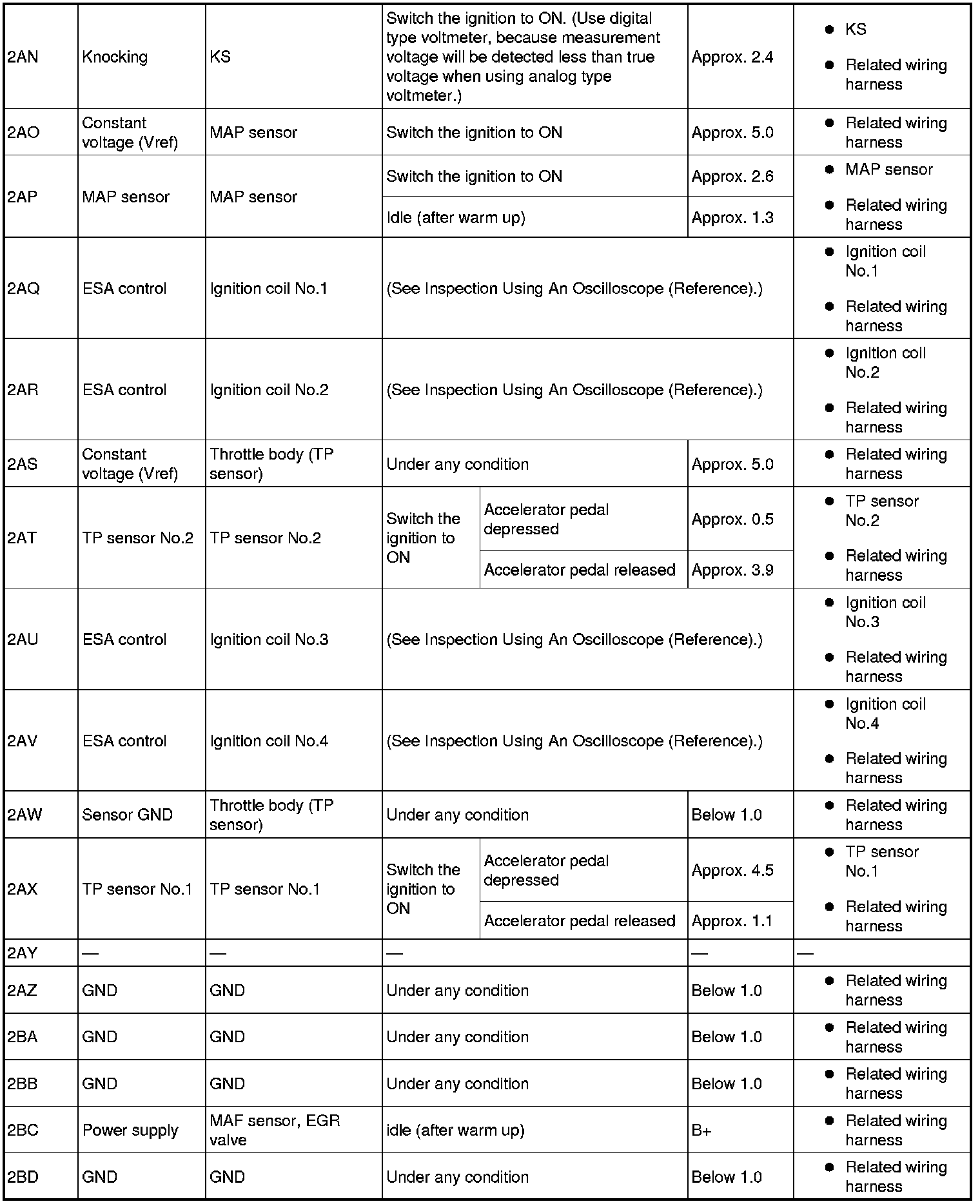 - Ignition coil No.4: 2AV (+)-Negative battery terminal (-)