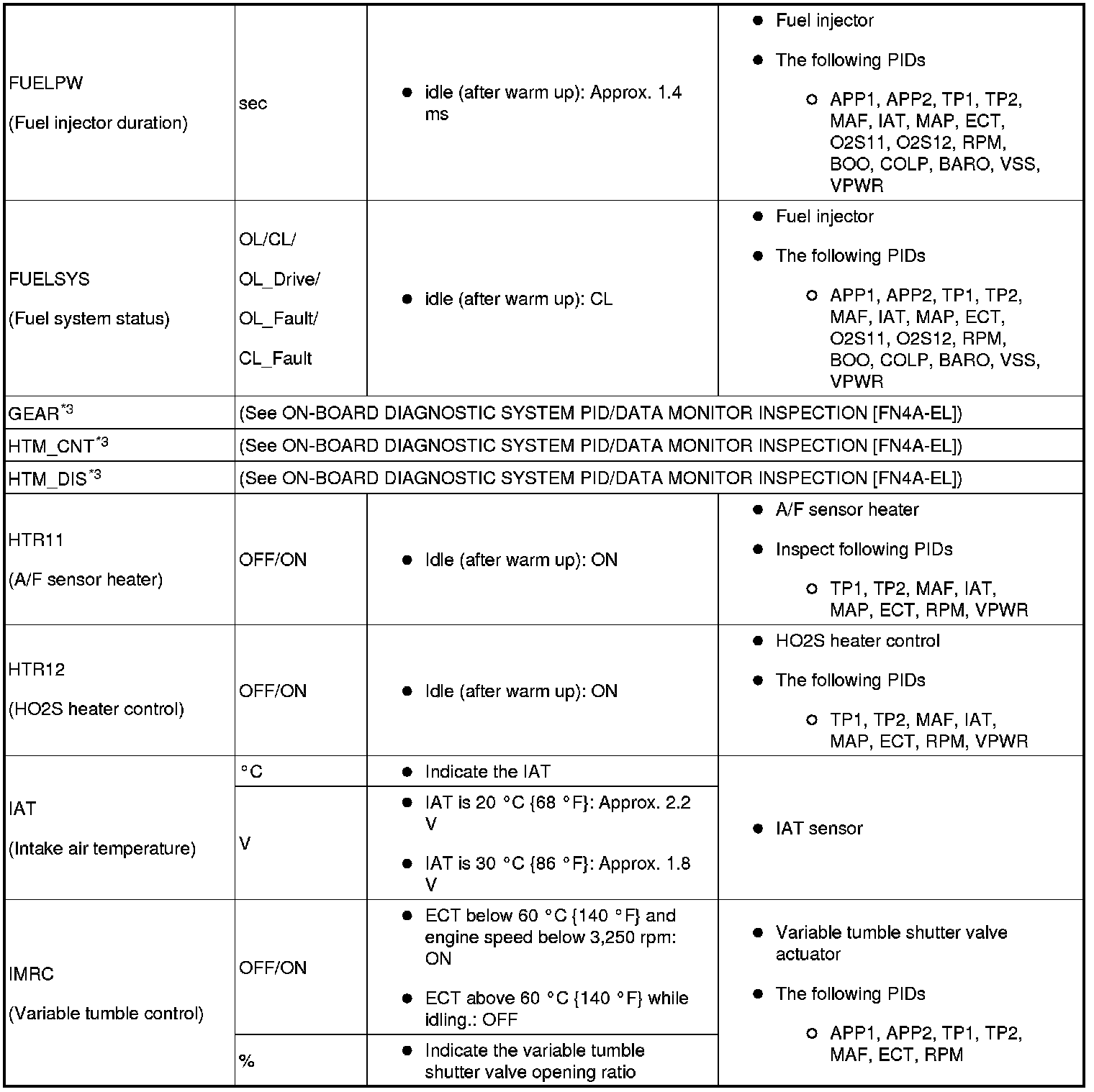 - If PID value is not within the specification, follow the instructions in Action column.