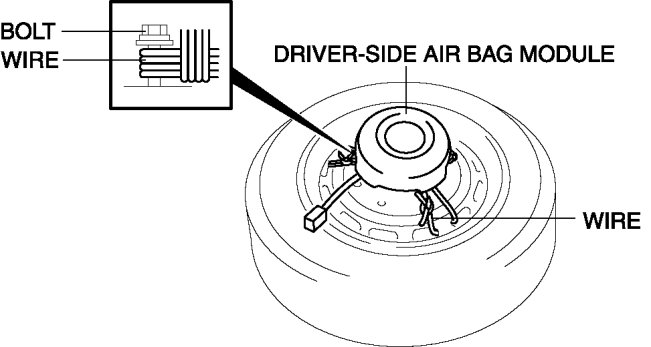 4. Place the driver-side air bag module on the center of the tire wheel with the padded surface facing up. To secure the air bag module to the tire wheel, wrap a wire (cross section 1.25 mm2 {0.002 in2} or more) through the wheel and the bolt installation holes of the air bag module at least 4 times.