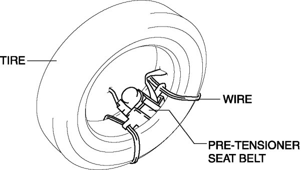 5. Put the pre-tensioner seat belt inside the tire and secure it to the tire by wrapping a wire (cross section of 1.25mm2 {0.002in2} or more) through the tire and the bolt installation holes at least 4 times.