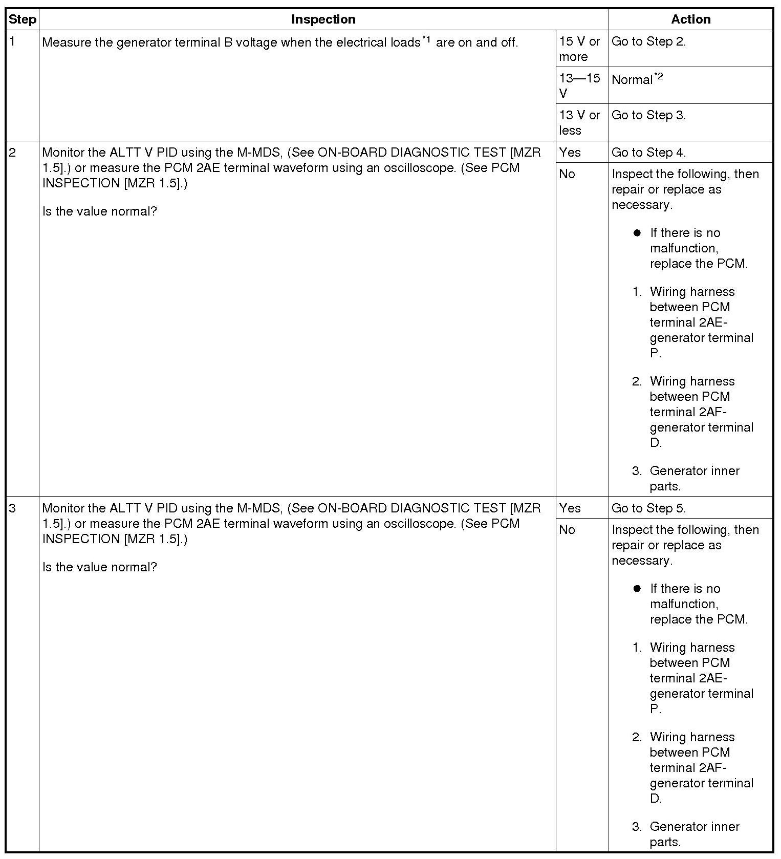 1 When the electrical load on the vehicle is low, the specified current cannot be verified although the generator is normal. In this case, increase the electrical load (Leave the headlights turned on for a while, then discharge the battery, or use a similar method.) and recheck.